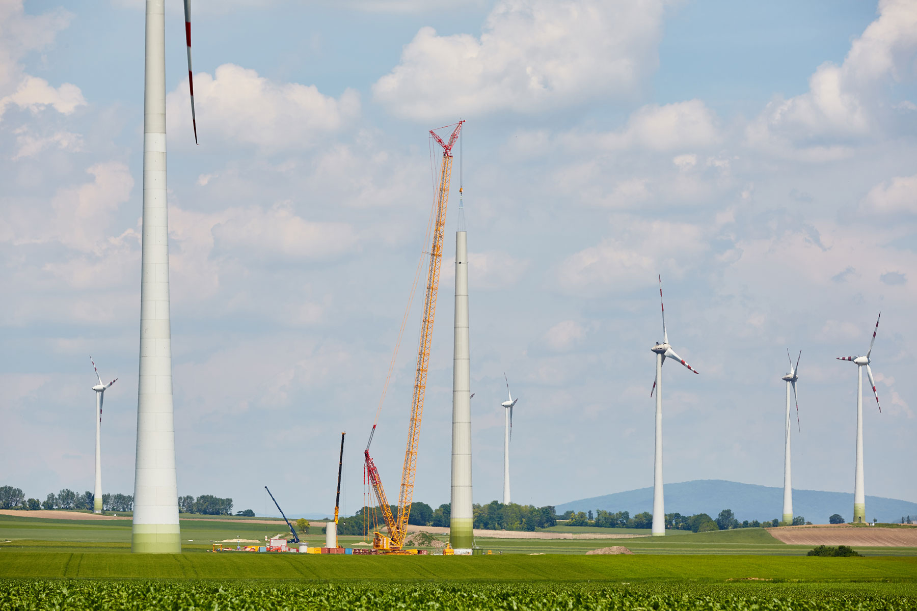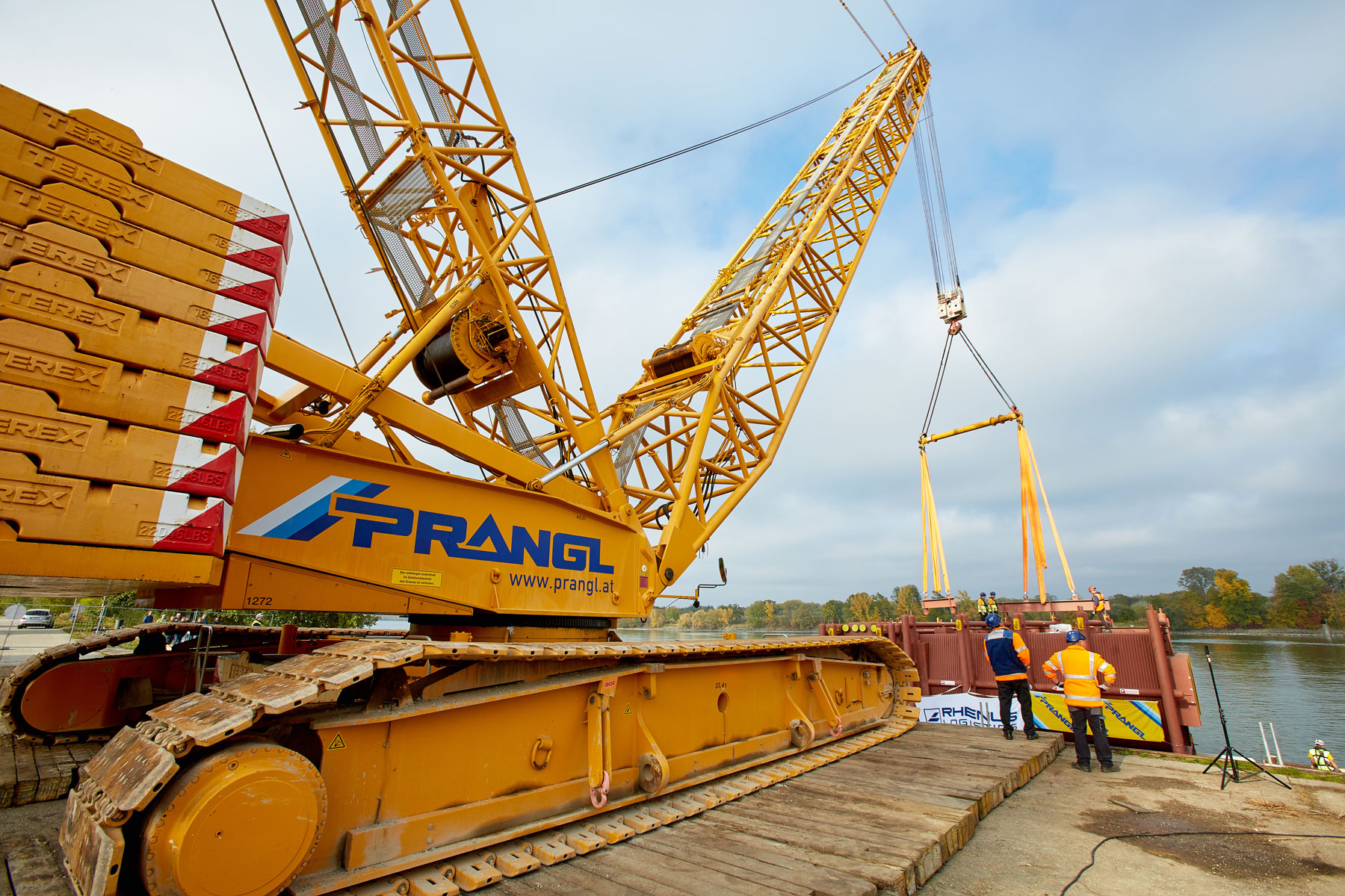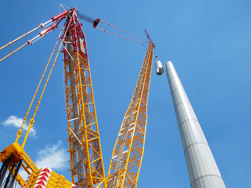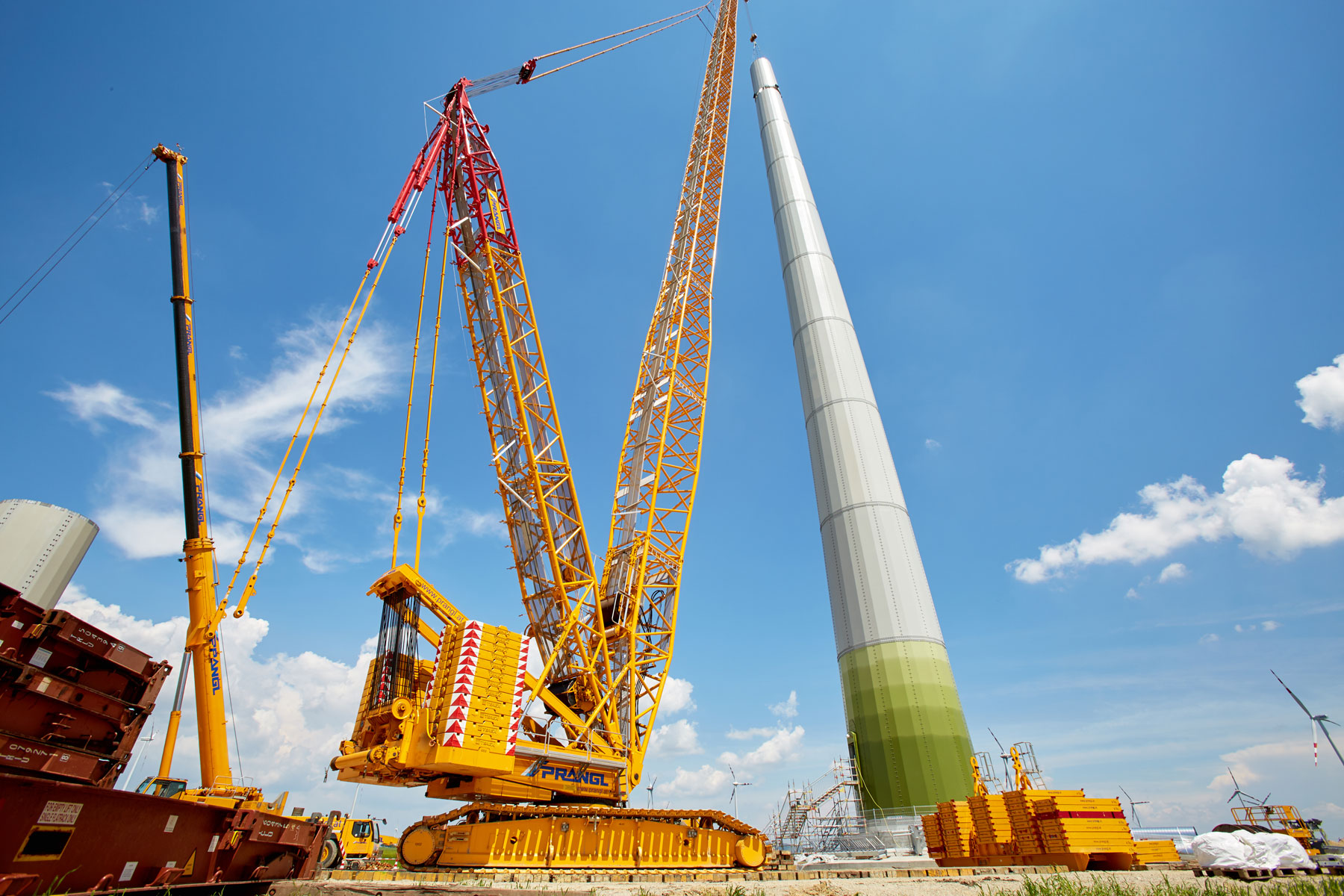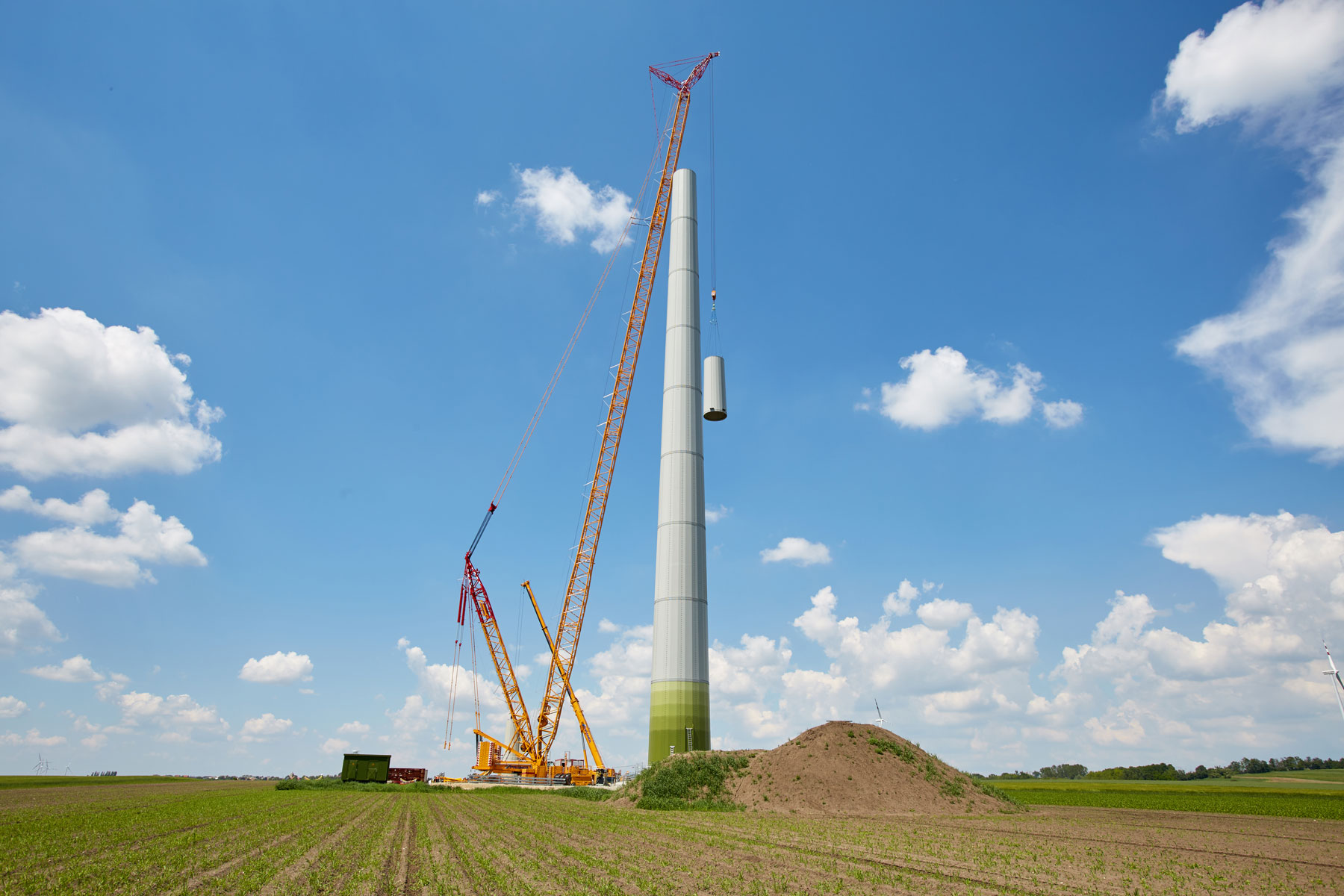 V Scharndorfu, v Spodnji Avstriji, smo na višini 135 m modularnega jeklenega stebra namestili vetrno turbino. Glavna montaža je zahtevala veliko premično dvigalo. Z goseničnim dvigalom nosilnosti 650 t smo na koncu našli ustrezno opremo. Ker je šlo za prototip in s tem nova sredstva za pritrjevanje, je bilo treba celotno glavno roko montirati višje kot običajno. Celoten dvižni sistem je dosegel višino 156 m, tehtal pa je 950 t.