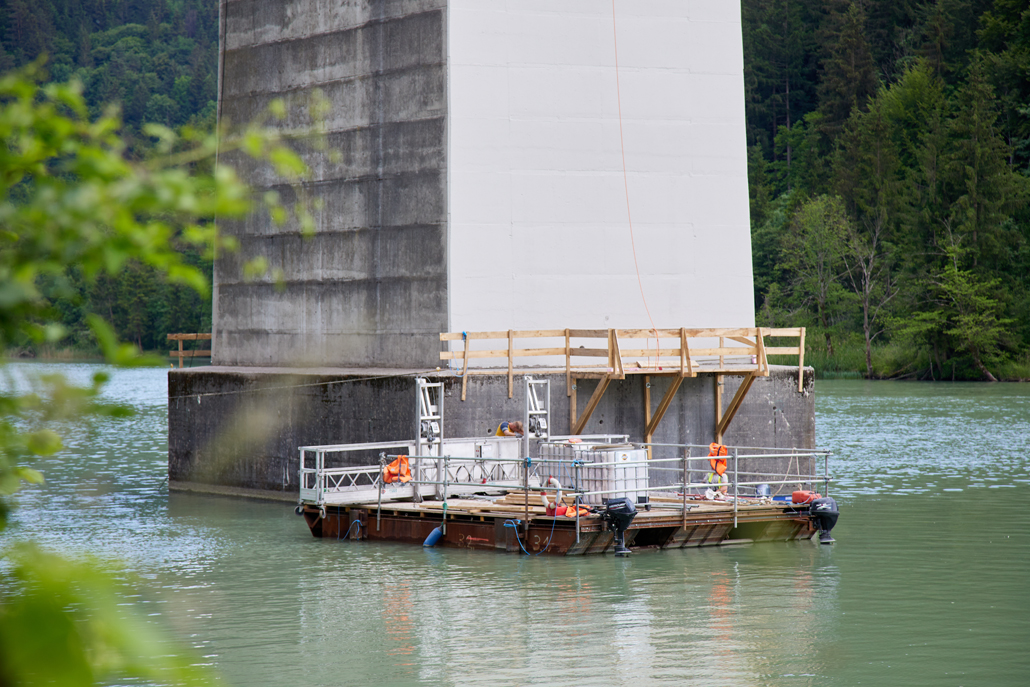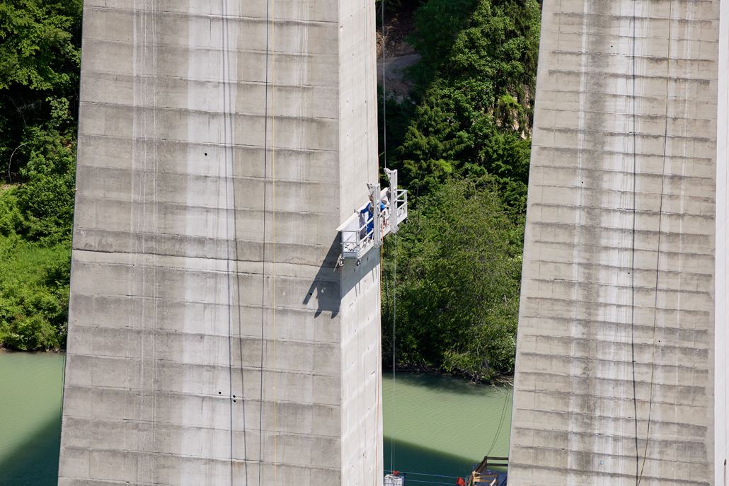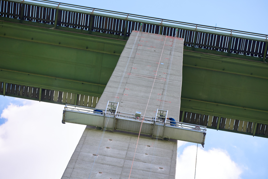 Osem visečih delovnih ploščadi z dolžino košare 8 ali 12 metrov in nosilnostjo do 760 kilogramov so pripeljali na obrežje Drave. Tam so jih naložili na plavajoče ploščadi, za katere je bilo na območju pomolov zgrajeno ločeno pristanišče. Viseče delovne ploščadi so nato s pontonom prepeljane do ustreznega stebra in s posebno konstrukcijo pritrjene na stebre mostu. Na ta način so bila potrebna obnovitvena dela opravljena tudi na težje dostopnih mestih.