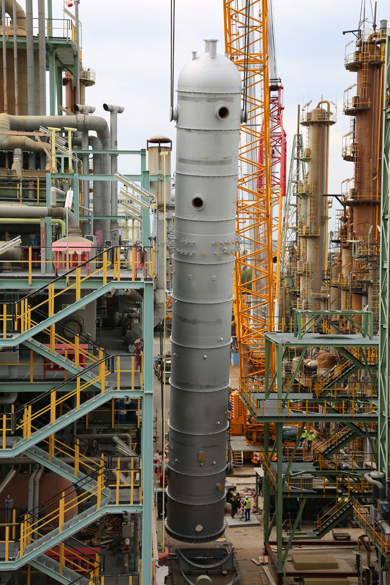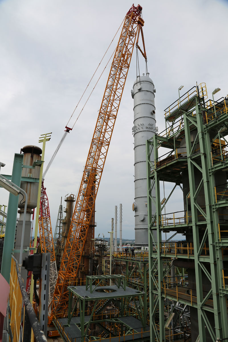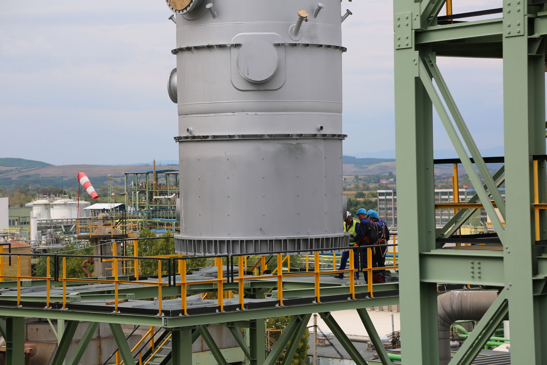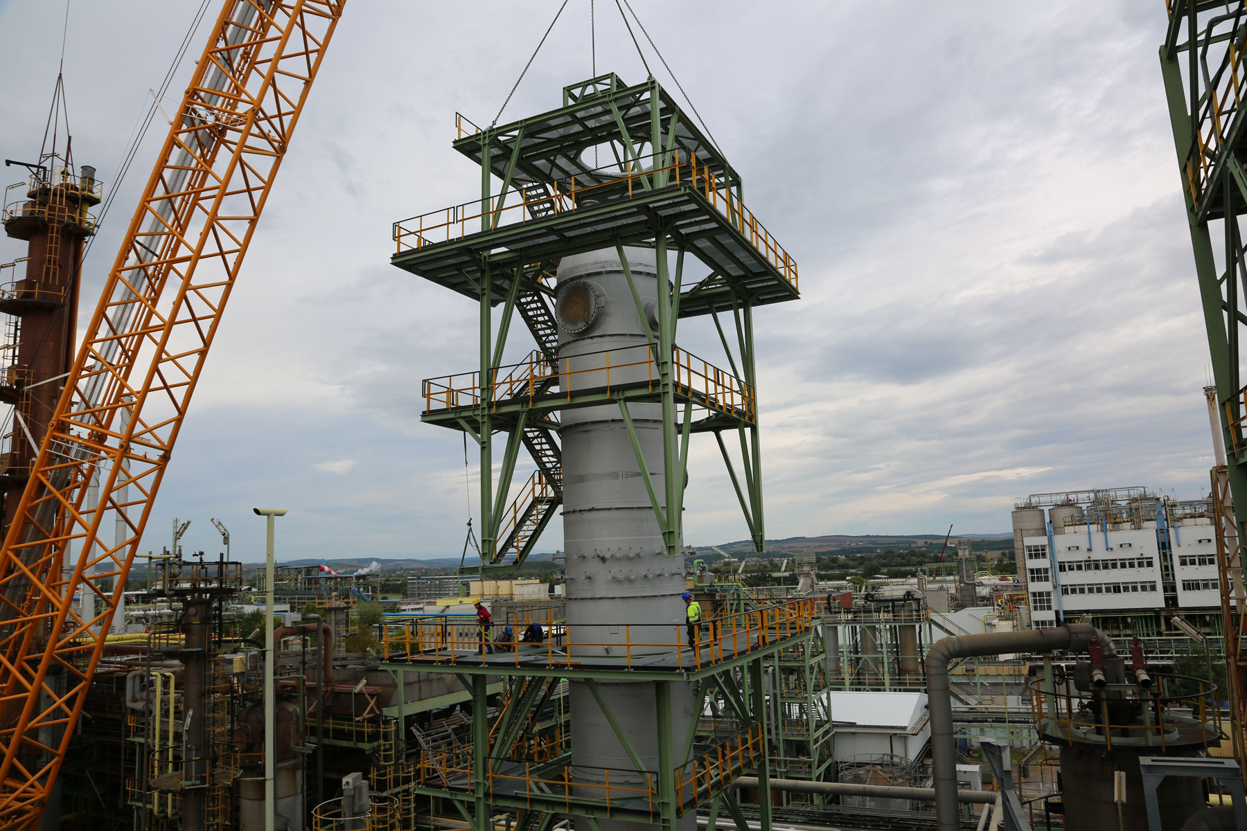 Reaktor (premer 4,8 m) so naredili na JZ Madžarske in ga po cesti prepeljali v Kazincbarciko. V tamkajšnji kemijskem obratu sta reaktor sprejela gosenično dvigalo nosilnosti 650 t in teleskopsko dvigalo nosilnosti 250 t. V tandemskem dvigu smo reaktor dvignili in usmerili za namestitev v končni položaj. Da bi lahko jamčili za ta podvig, smo gosenično dvigalo opremili z 72-metrsko roko in 460-tonskimi protiutežmi. Skupno je kolos tehtal 721,6 t.