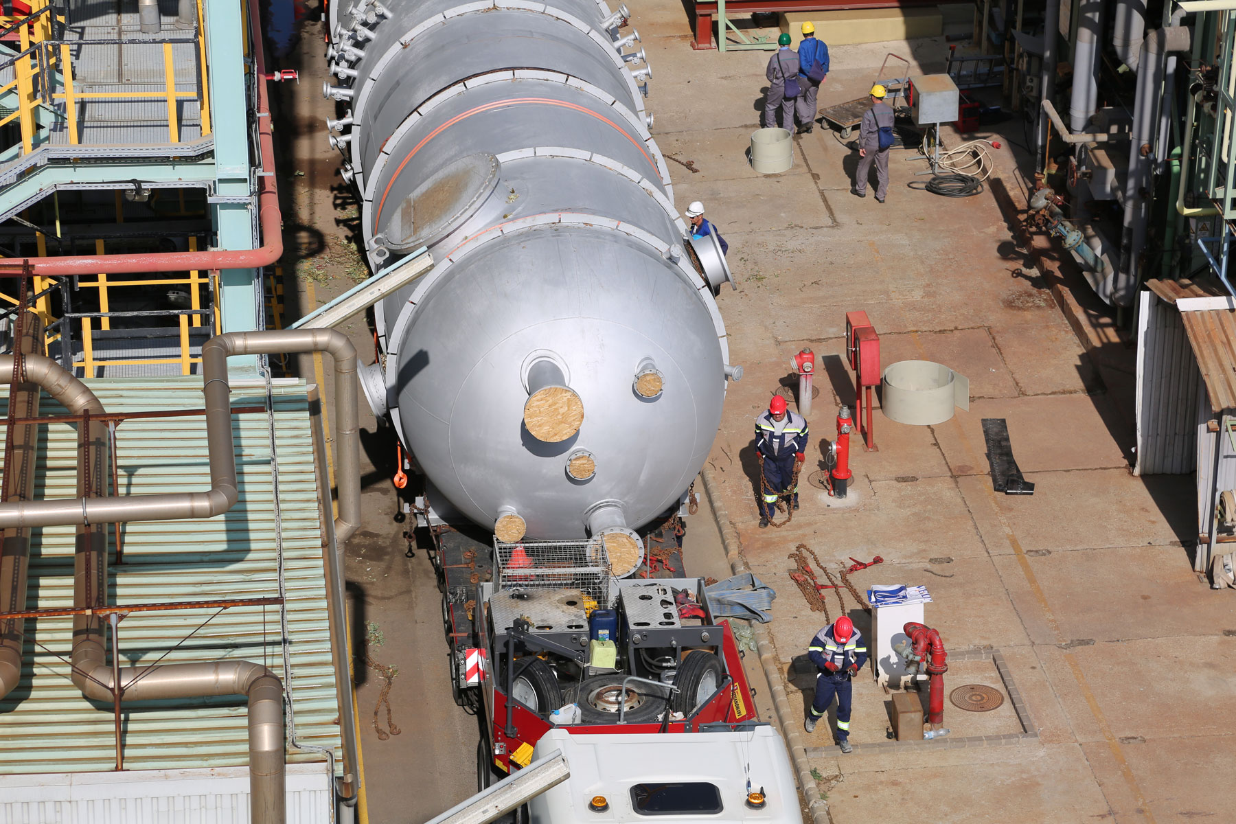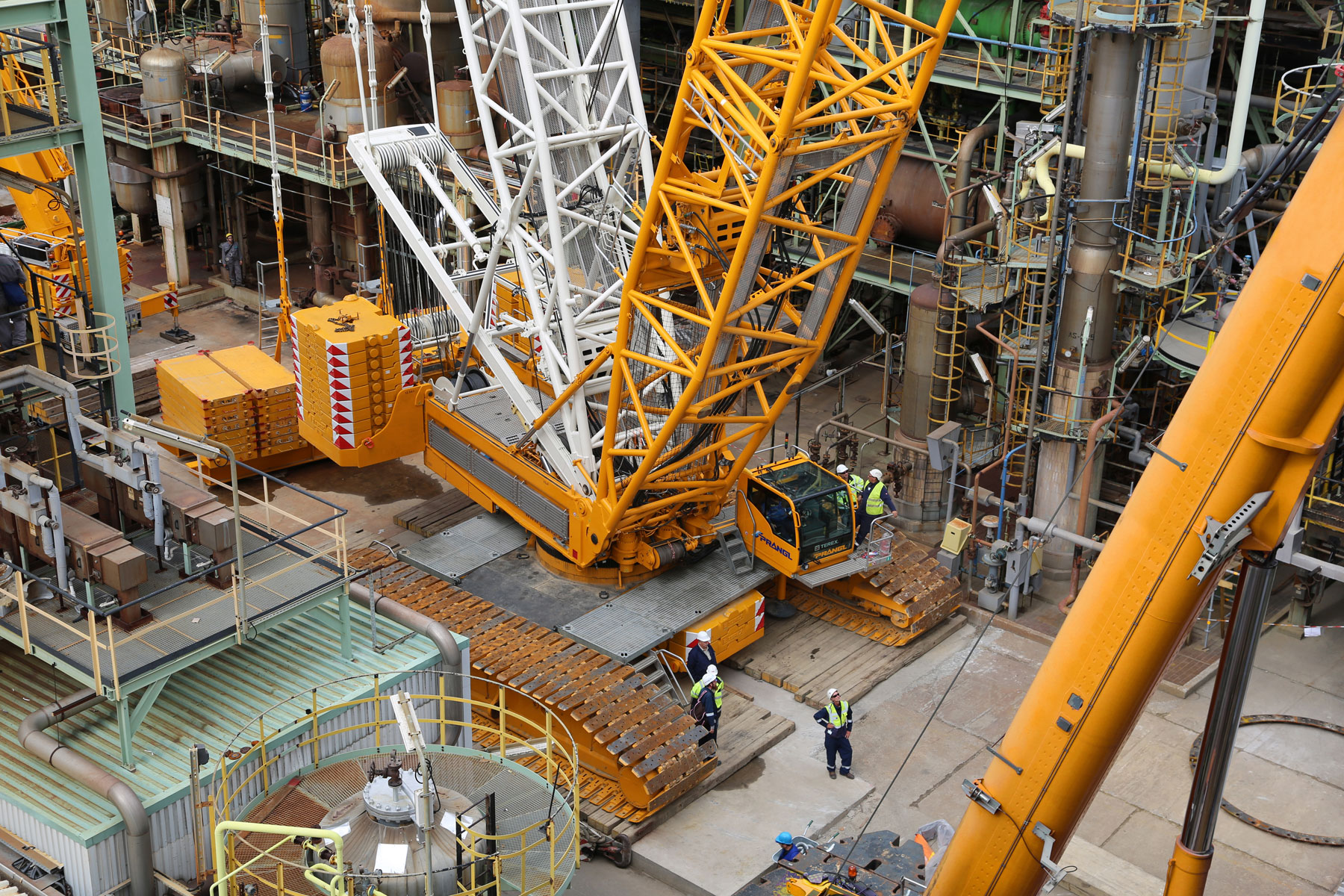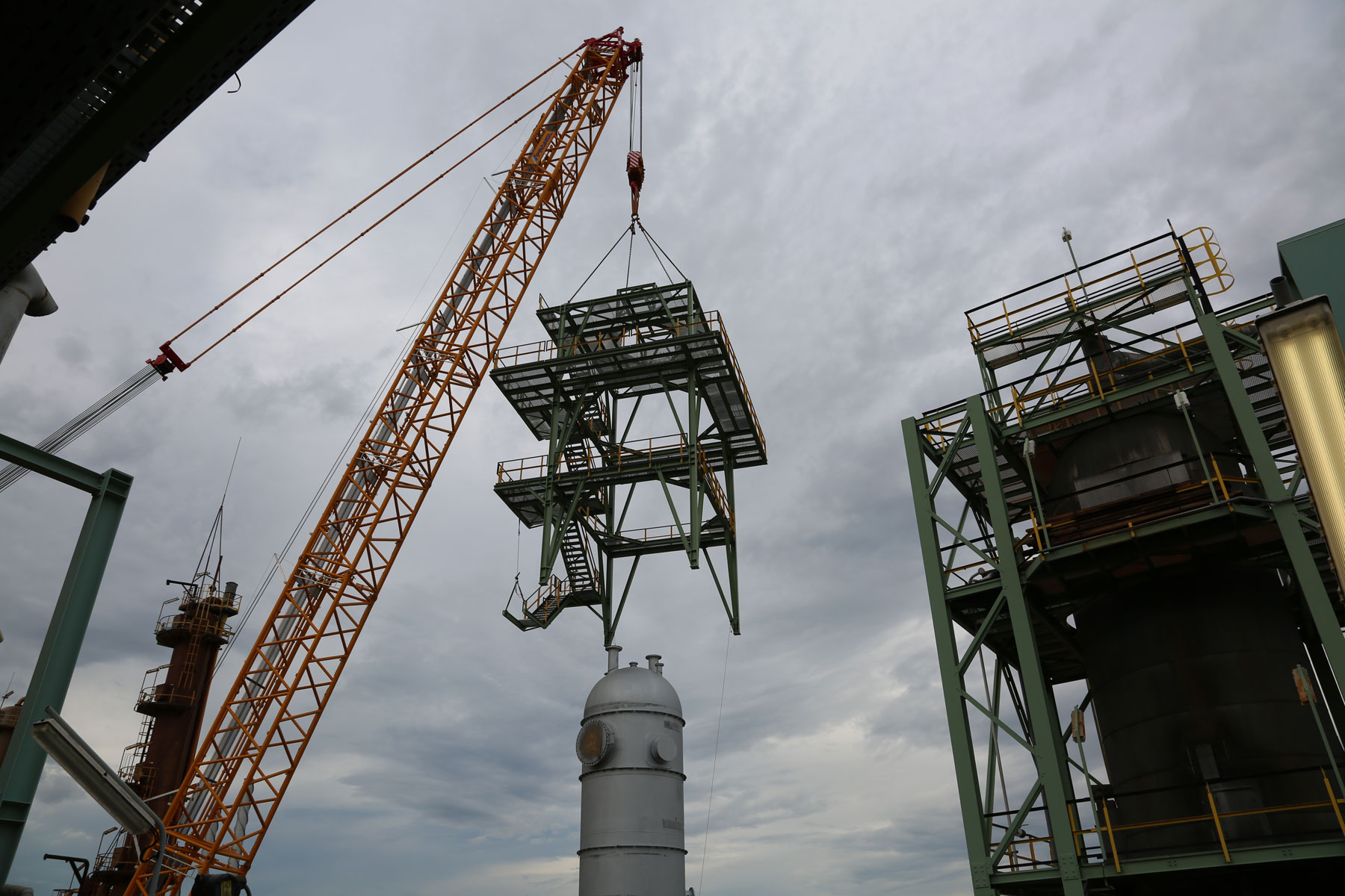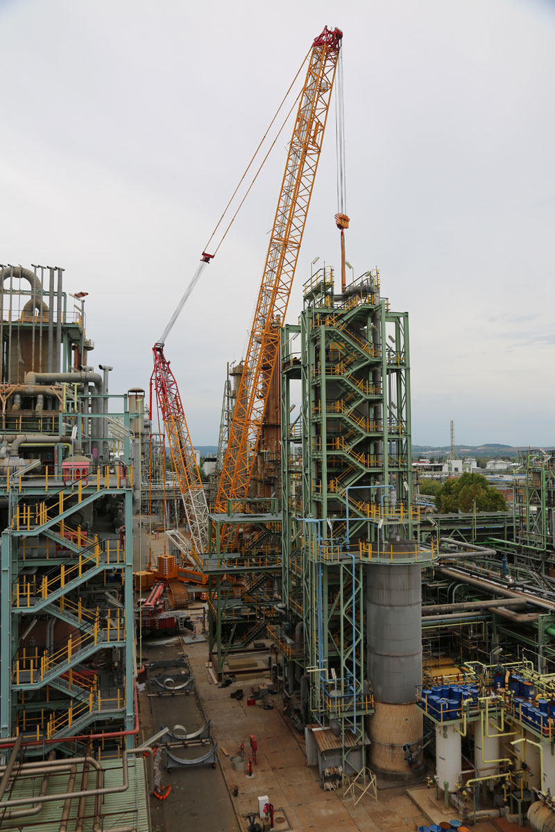 Reaktor (premer 4,8 m) so naredili na JZ Madžarske in ga po cesti prepeljali v Kazincbarciko. V tamkajšnji kemijskem obratu sta reaktor sprejela gosenično dvigalo nosilnosti 650 t in teleskopsko dvigalo nosilnosti 250 t. V tandemskem dvigu smo reaktor dvignili in usmerili za namestitev v končni položaj. Da bi lahko jamčili za ta podvig, smo gosenično dvigalo opremili z 72-metrsko roko in 460-tonskimi protiutežmi. Skupno je kolos tehtal 721,6 t.