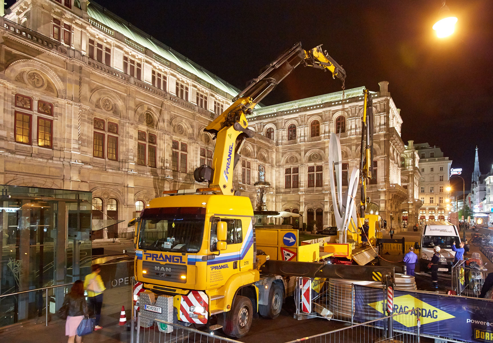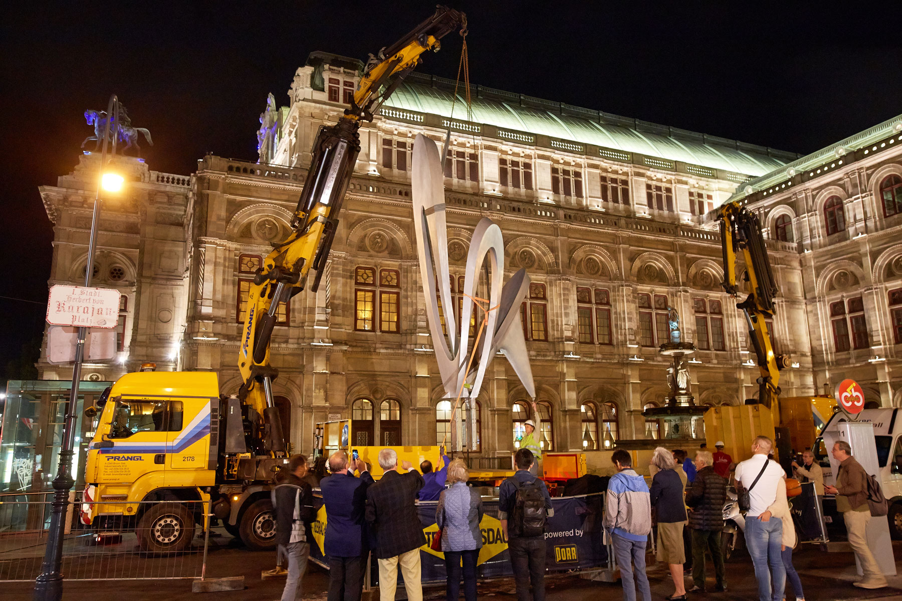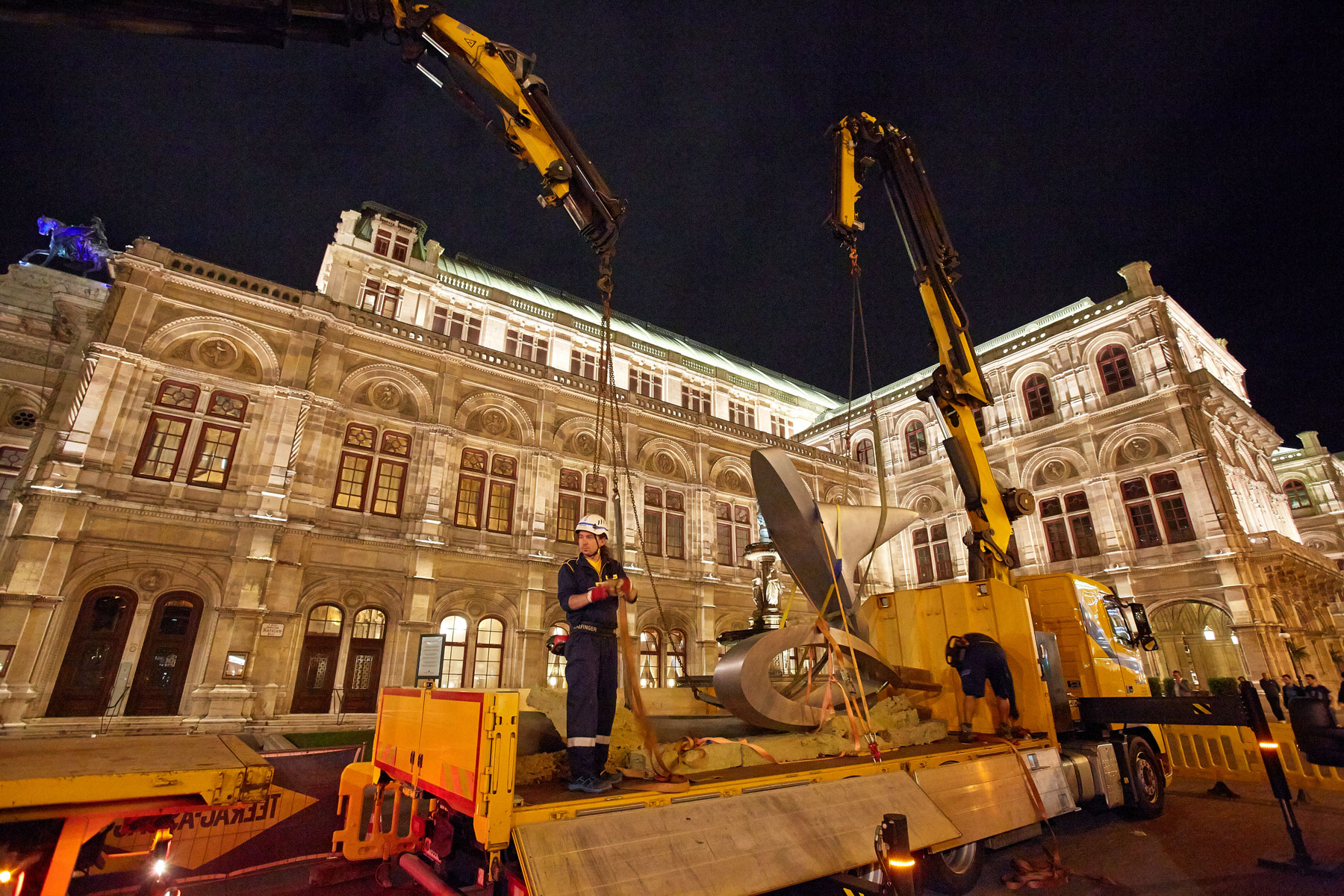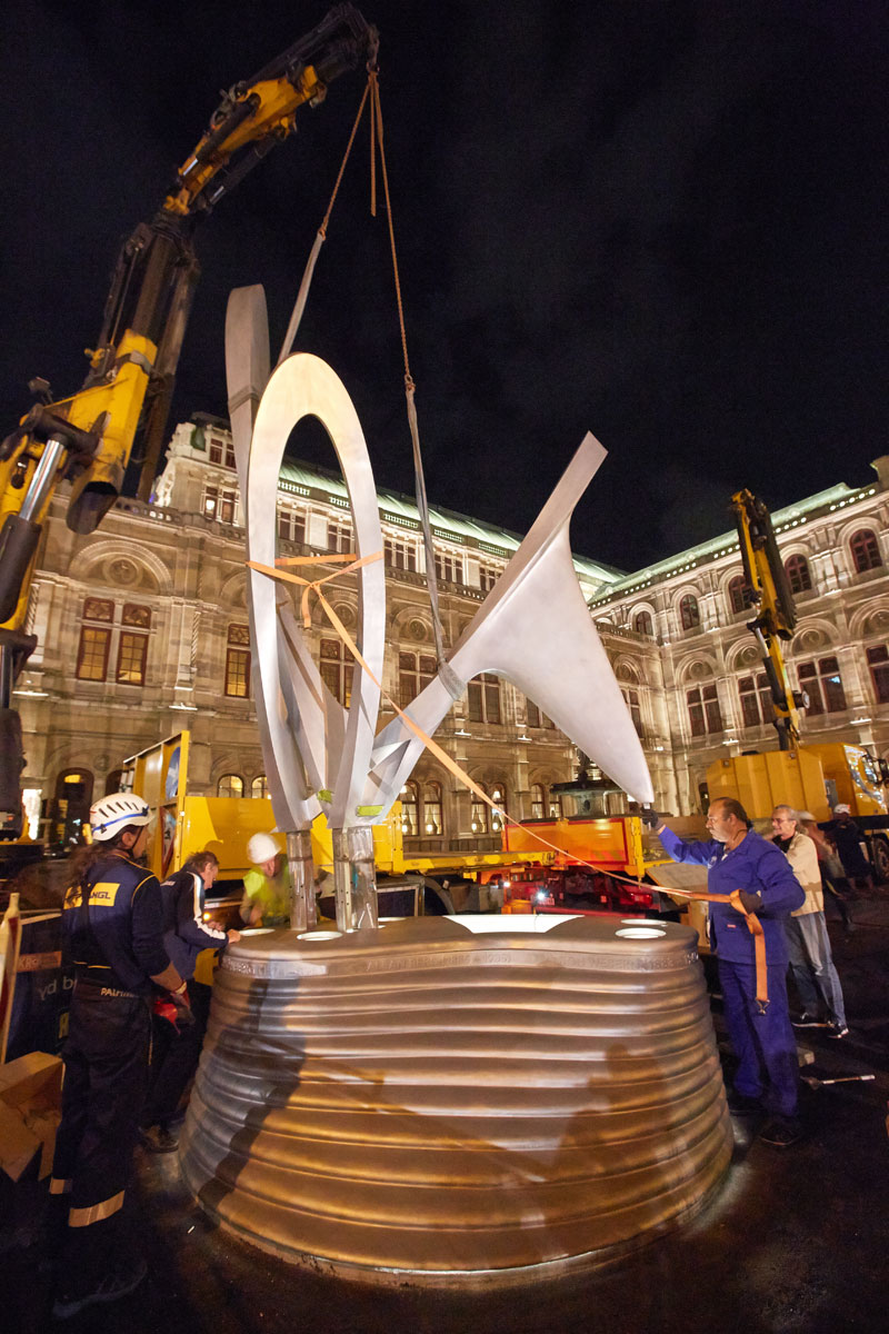 Za tak koncept dviga so se Pranglovi strokovnjaki odločili, ker delovišče meji na dunajsko Državno opero. Nadaljnja razloga za izbiro nakladalnih dvigal sta bili njuna prilagodljivost in okretnost, saj smo morali dvig opraviti v najkrajšem času. Zaradi temeljitih priprav, dobrega poznavanja lokalnih okoliščin na osnovi prejšnjih del na Trgu Herberta von Karajana ter natančnega dela smo uspešno zaključili tudi ta, umetnostni projekt.