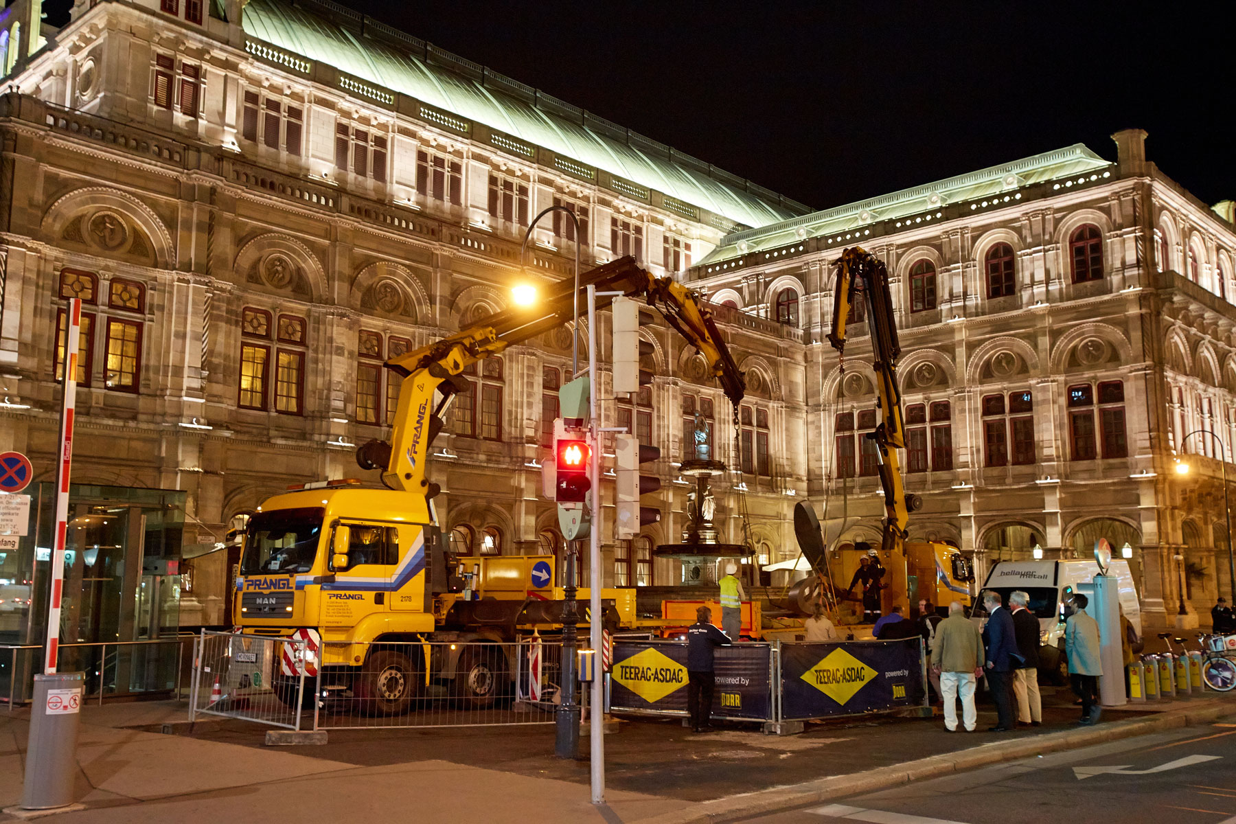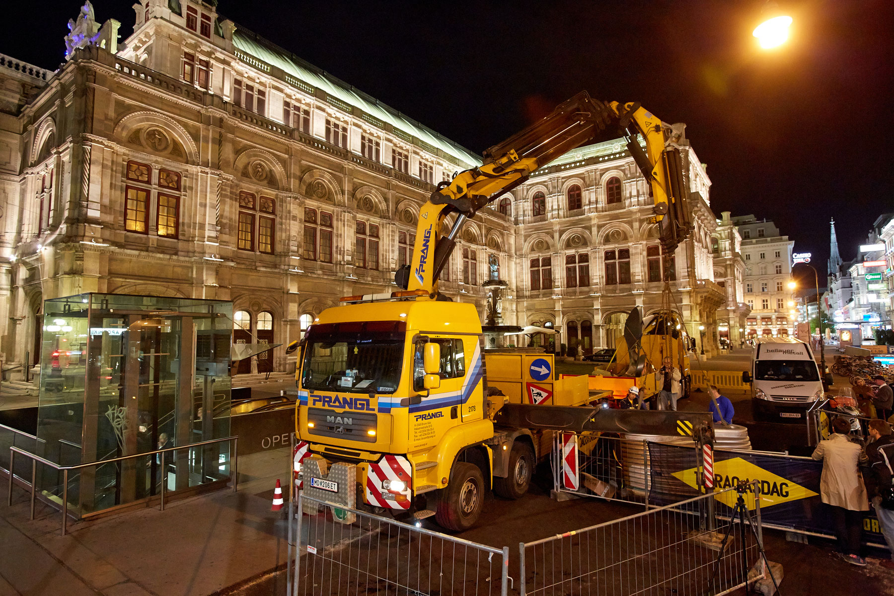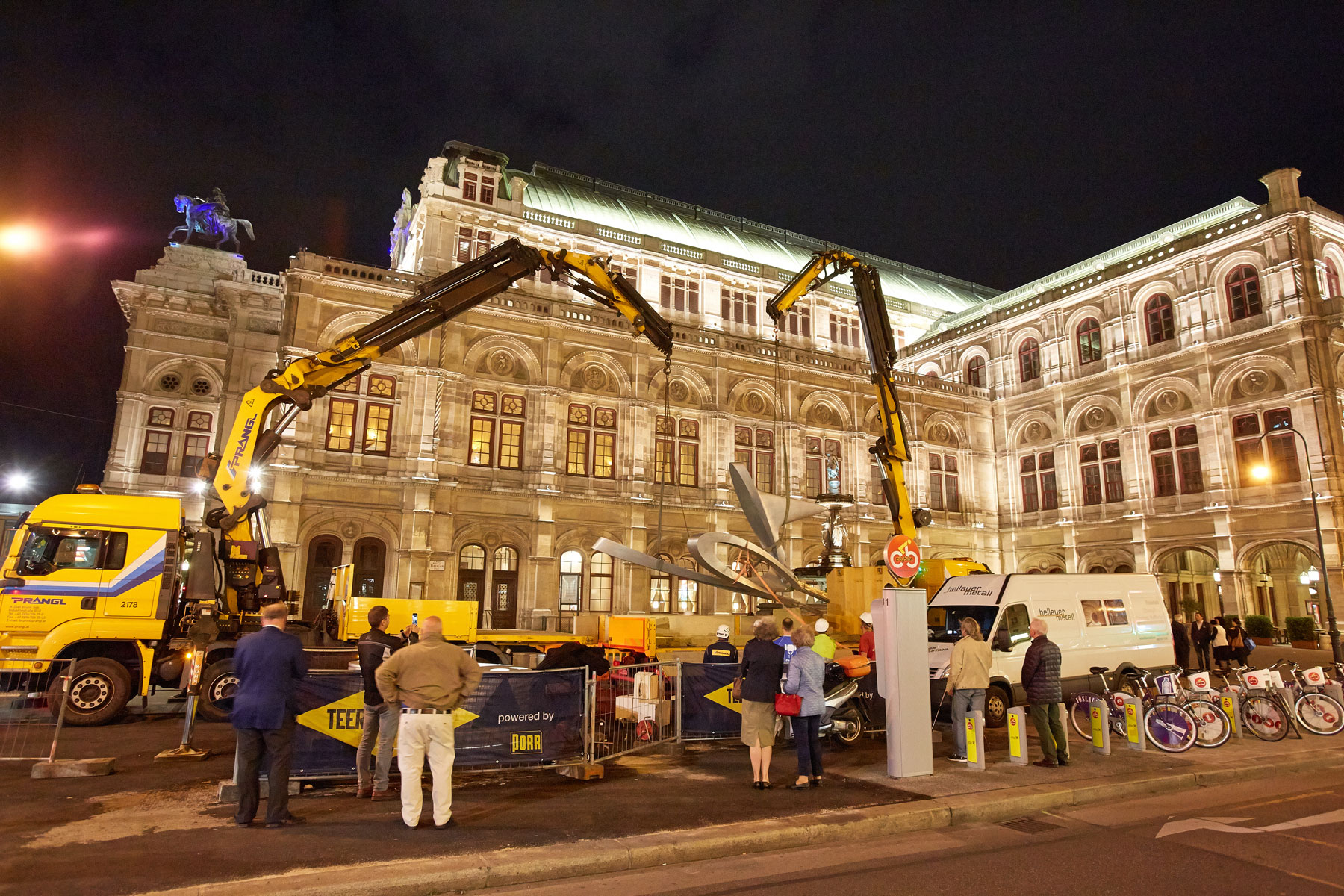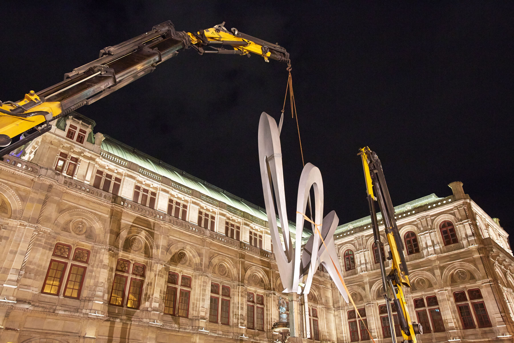 Za tak koncept dviga so se Pranglovi strokovnjaki odločili, ker delovišče meji na dunajsko Državno opero. Nadaljnja razloga za izbiro nakladalnih dvigal sta bili njuna prilagodljivost in okretnost, saj smo morali dvig opraviti v najkrajšem času. Zaradi temeljitih priprav, dobrega poznavanja lokalnih okoliščin na osnovi prejšnjih del na Trgu Herberta von Karajana ter natančnega dela smo uspešno zaključili tudi ta, umetnostni projekt.