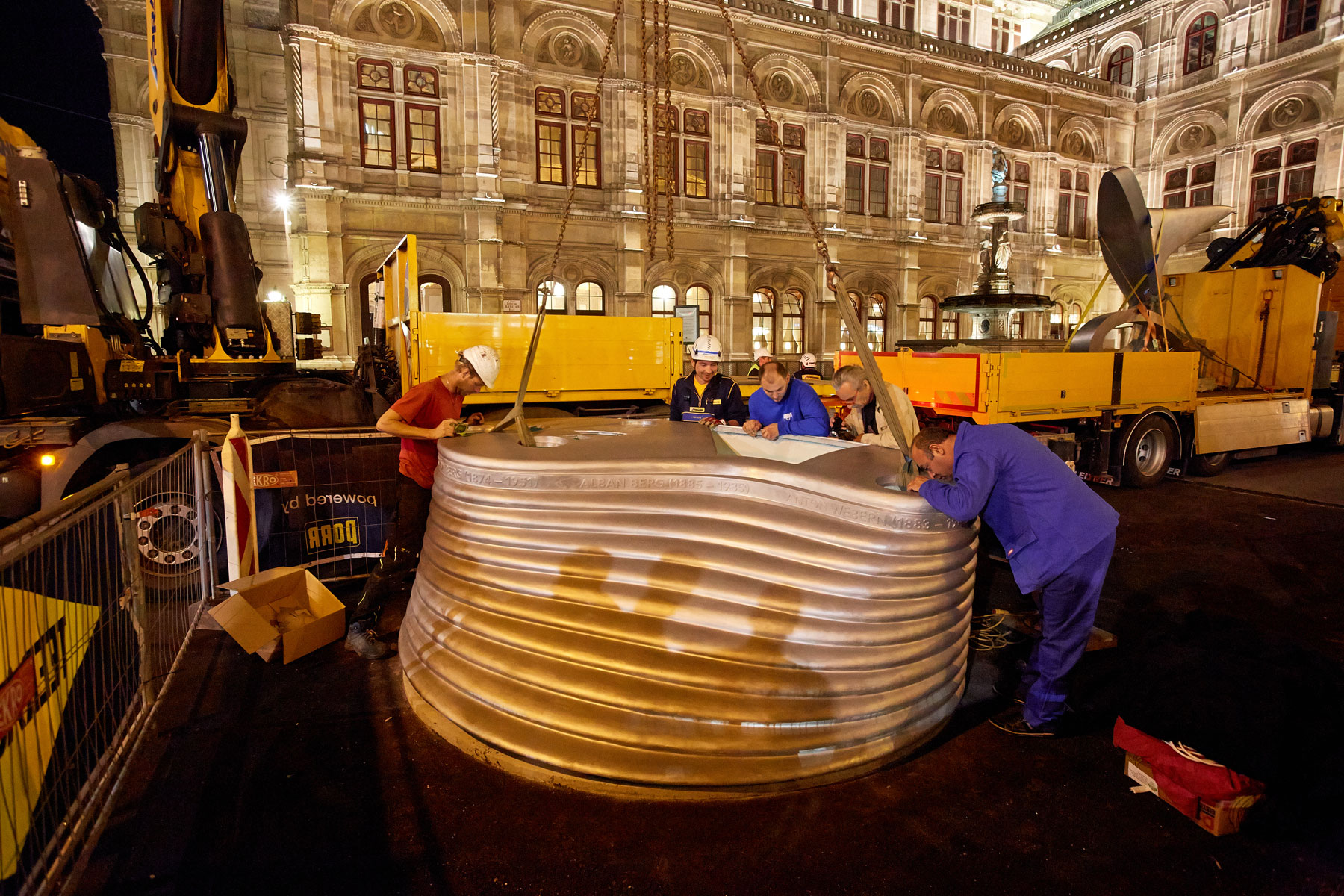 Spomenik, ki ga je financiral sklad komponista Albana Berga in ustvaril arhitekt prof. Wolf D. Prix v čast Dunajski šoli moderne (orig.: Wiener Schule) ter simbolično pooseblja avstrijske skladatelje Albana Berga, Arnolda Schönberga ter Antona Weberna, smo prepeljali iz Mödlinga na Dunaj. Z dvema nakladalnima dvigaloma smo podnožje in skulpturo postavili na trgu dirigenta Herberta von Krajana.