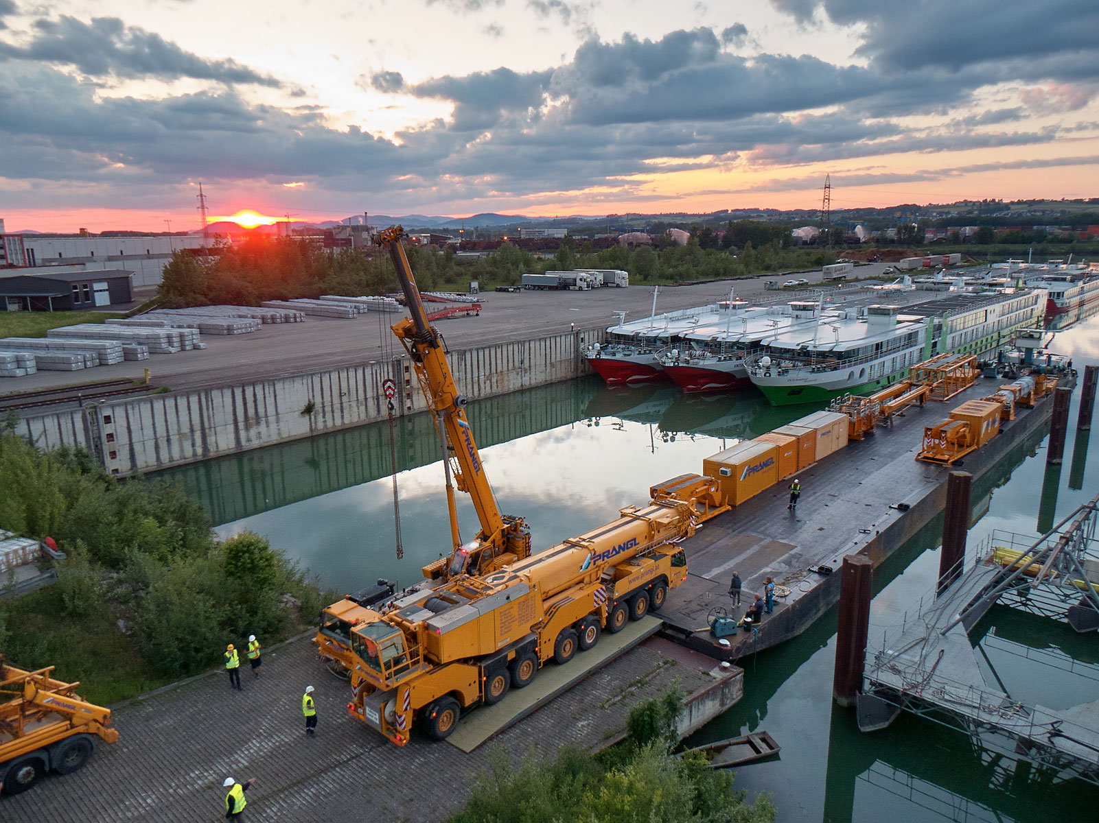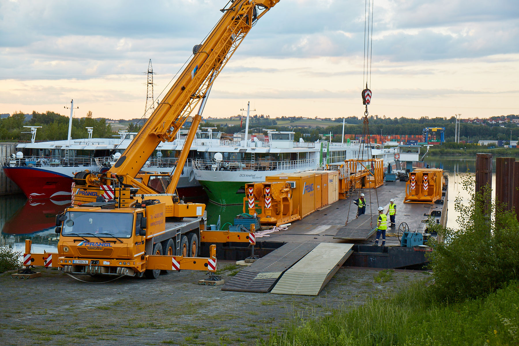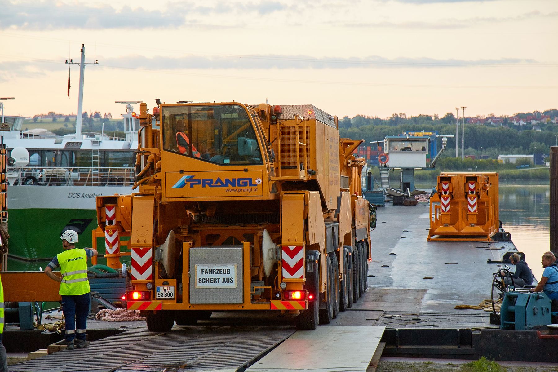 Dostava tega paketa dvigal je potekala večnačinovno oz. multimodalno, z ladjo in po cesti. Najprej je tovor potoval po reki od Ennshafna do Terneuzena, na Nizozemskem. Potisni sestav s transportno Ro-Ro ladjo je bil 80 m dolg in 11,5 m širok. V Ennshafenu je pristala Ro-Ro ladja s premično rampo, preko katere so bila nanjo prepeljana mobilna dvigala. Dvig ustrezne opreme na ladjo je potekal s teleskopskim dvigalom nosilnosti 250 t.
