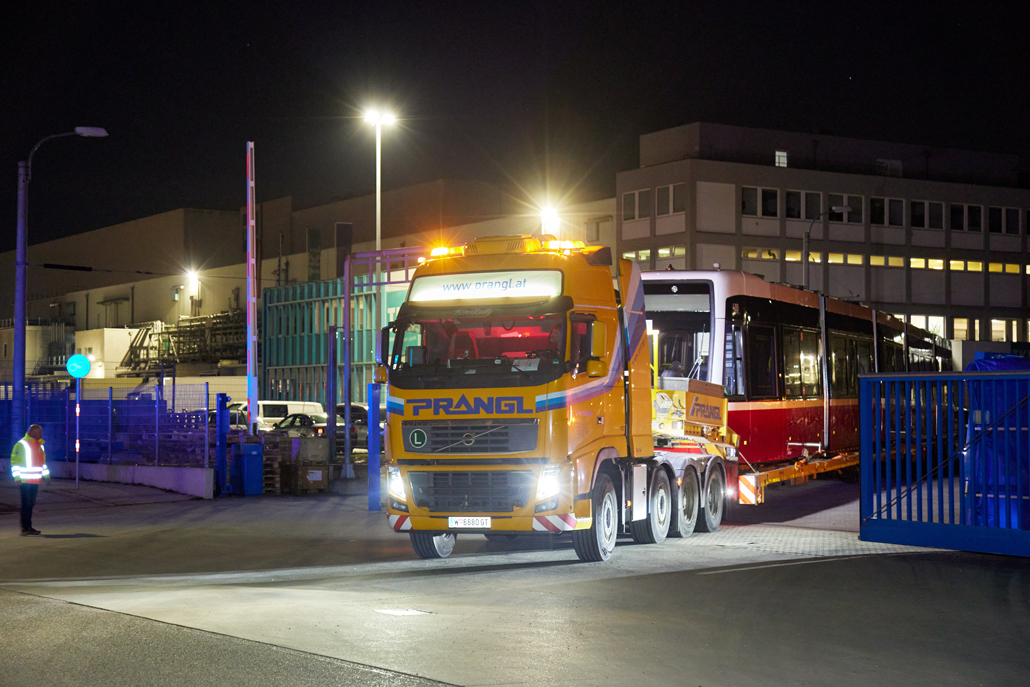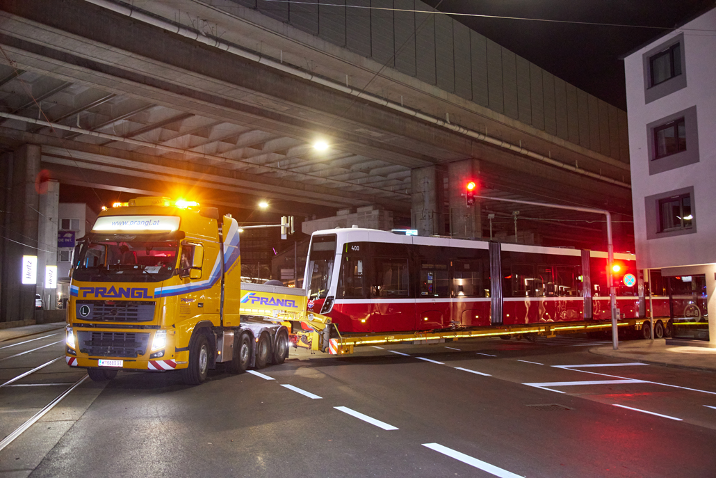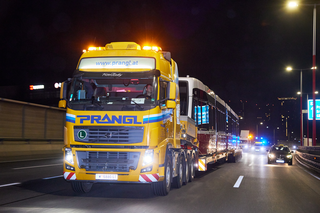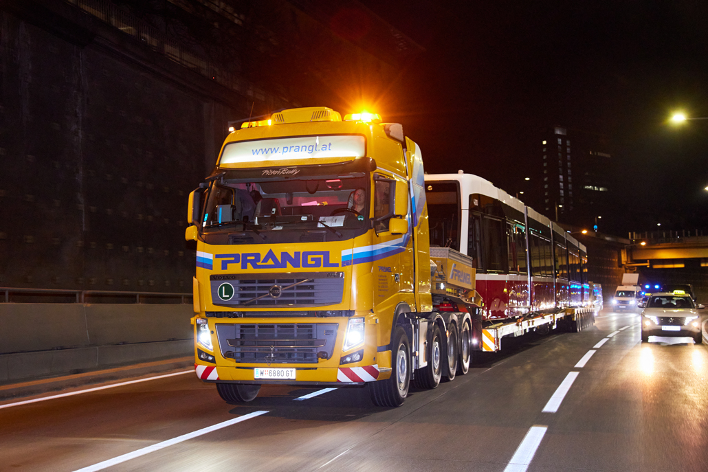 Dunajski tramvaj Flexity je dolg 34 metrov, sprejme lahko 211 potnikov, je popolnoma brez ovir za invalide in se ponaša z najsodobnejšo tehnologijo. Prangl ima v svoji floti posebno kombinacijo vozil za prevoz takšnih zahtevnih tovorov z ene lokacije na drugo: vlačilec, združen s posebej prilagojenim prevoznim vozilom za železniške vagone. Ta kombinacija si je v preteklih letih in pri številnih primerljivih projektih – predvsem na Dunaju – pridobila odličen sloves in se redno uporablja za prevoz tramvajev Flexity, saj se je izkazala za zelo okretno in vodljivo v urbanih območjih.