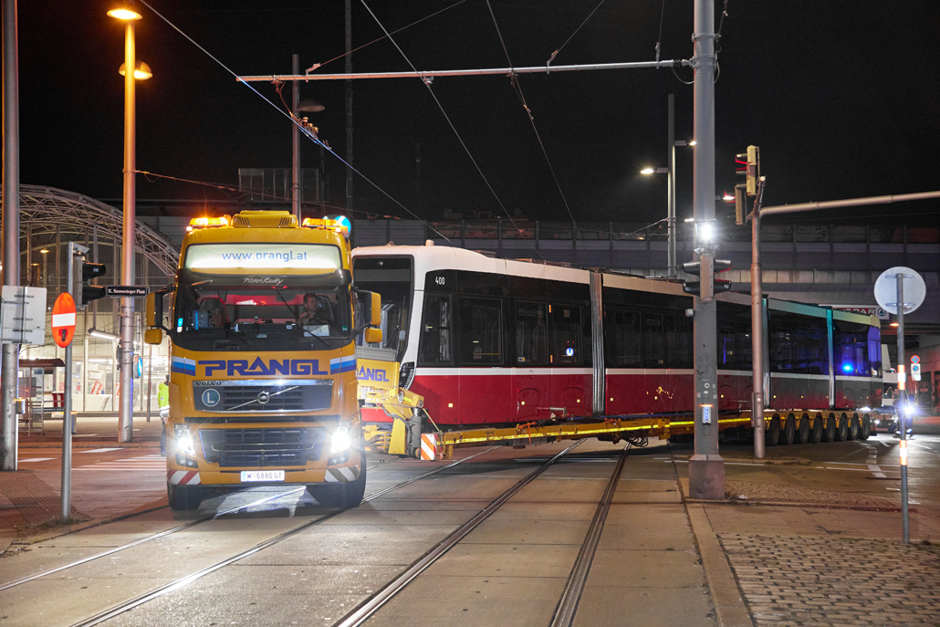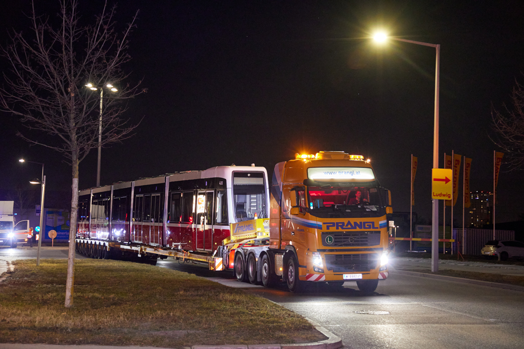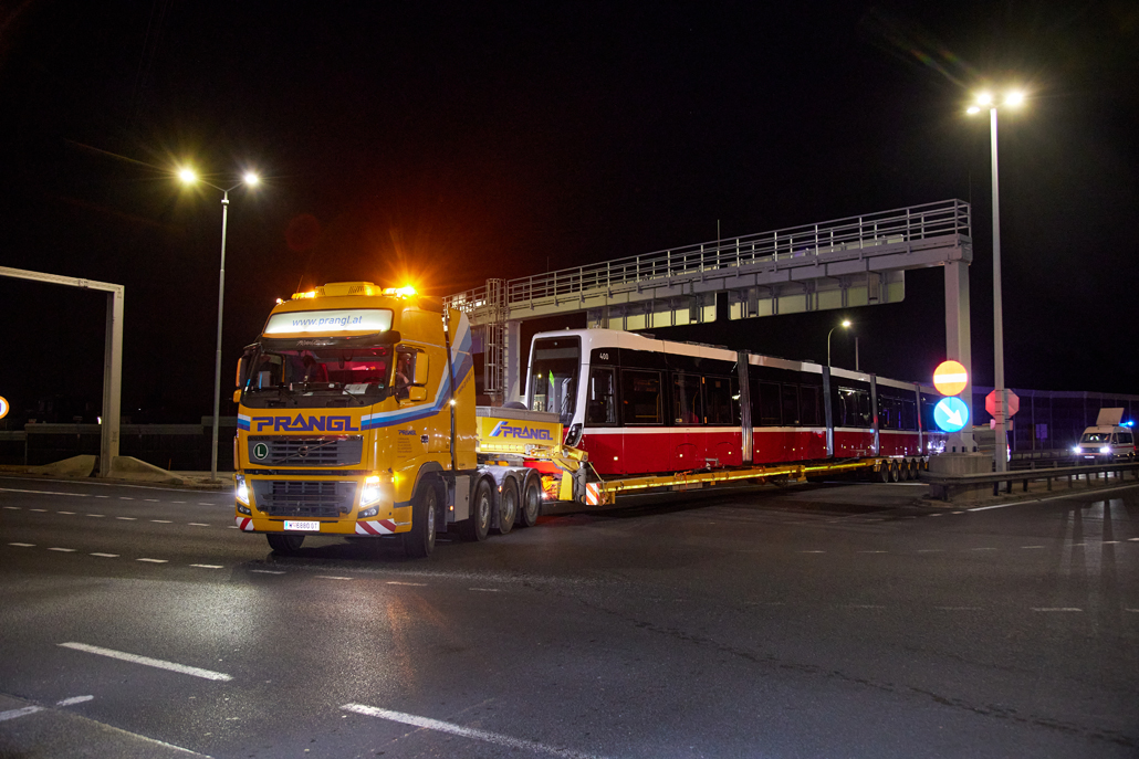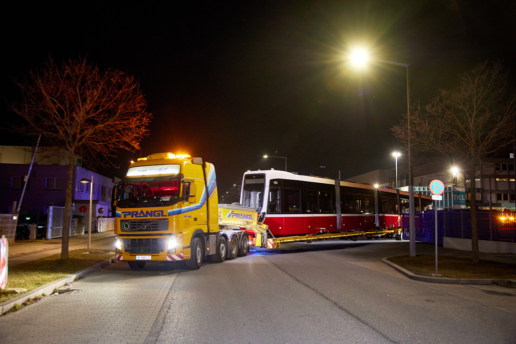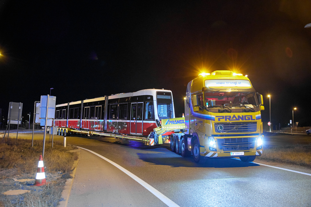 Dunajski tramvaj Flexity je dolg 34 metrov, sprejme lahko 211 potnikov, je popolnoma brez ovir za invalide in se ponaša z najsodobnejšo tehnologijo. Prangl ima v svoji floti posebno kombinacijo vozil za prevoz takšnih zahtevnih tovorov z ene lokacije na drugo: vlačilec, združen s posebej prilagojenim prevoznim vozilom za železniške vagone. Ta kombinacija si je v preteklih letih in pri številnih primerljivih projektih – predvsem na Dunaju – pridobila odličen sloves in se redno uporablja za prevoz tramvajev Flexity, saj se je izkazala za zelo okretno in vodljivo v urbanih območjih.