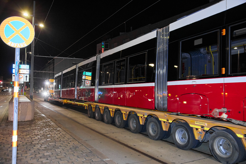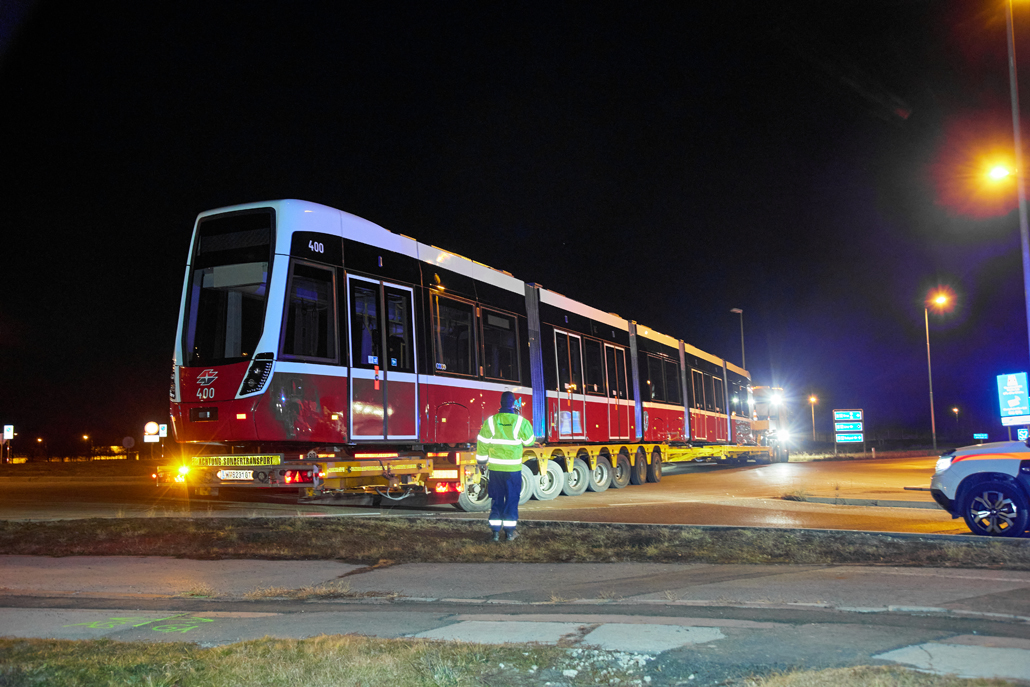 Za prevoz železniškega vagona Flexity je podjetje Prangl uporabilo posebno kombinacijo vozil, ki je bila najprej pripeljana v tramvajski depo Donaustadt v skrajšani različici. Naslednji dan so na lokaciji prilagodili priklopnik, da so lahko naložili 100. tramvaj Flexity. Celoten transportni vlak je dosegel dolžino 42,5 metra, širino 2,99 metra, višino 4,40 metra in skupno težo 99 ton. Naslednjo noč so se vozila podala na pot v spremstvu več podpornih vozil, pri čemer je vlačilec s podaljšanim tovorom krenil proti S2.