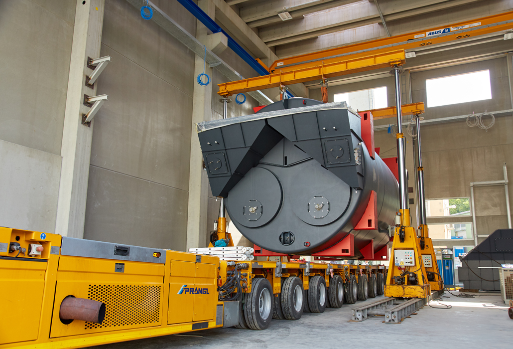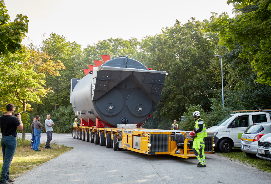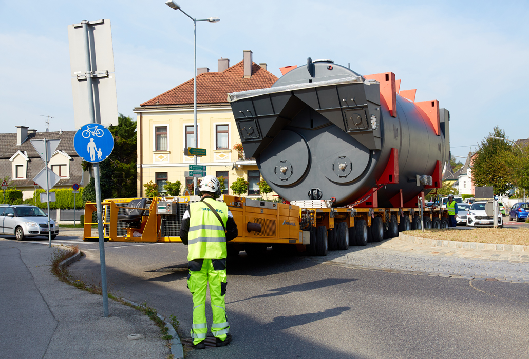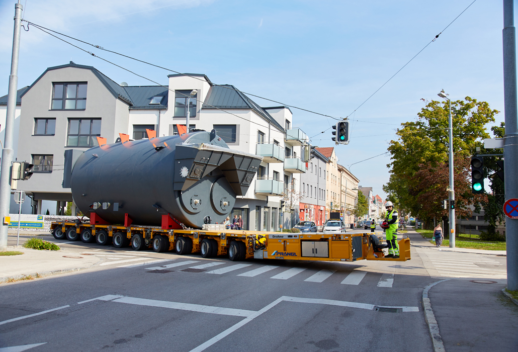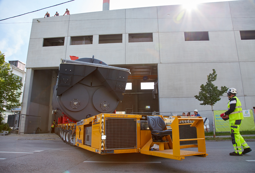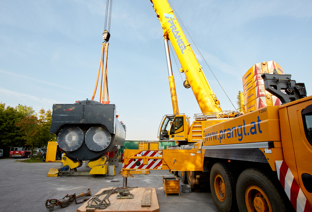 Z dokončanjem v hali so strokovnjaki podjetja Prangl ponovno izjemno demonstrirali zasnovo "Vse iz ene roke". Od natovarjanja prek cestnega prevoza do namestitve s posebnimi stroji je podjetje Prangl pokrivalo celotno logistiko. Hitro se je podjetje pri procesu načrtovanja osredotočilo na alternativne možnosti vnašanja opreme. Kot kompaktno in močno orodje za dviganje je prišel v poštev le hidravlični dvižni portal PHP 63. Zadnji metri do končnega položaja so bili premagani s pomočjo viličarjev in težkih valjarjev. Sodobna tehnologija ne samo pri pridobivanju energije temveč tudi na poti do cilja.