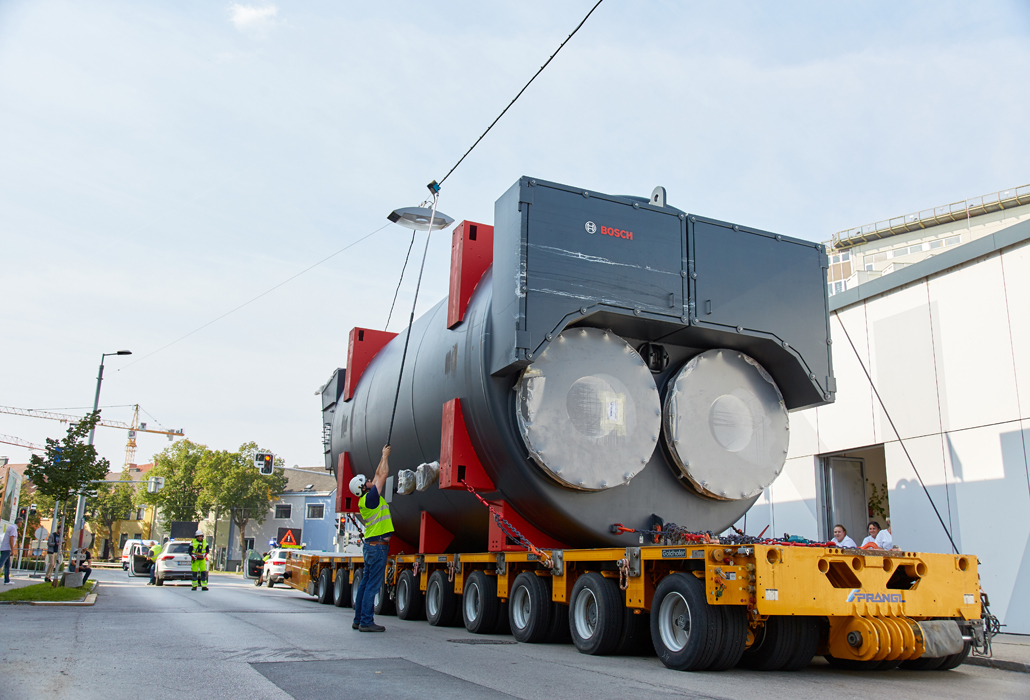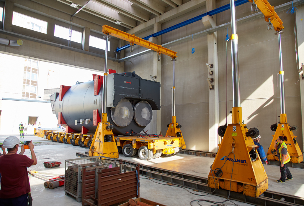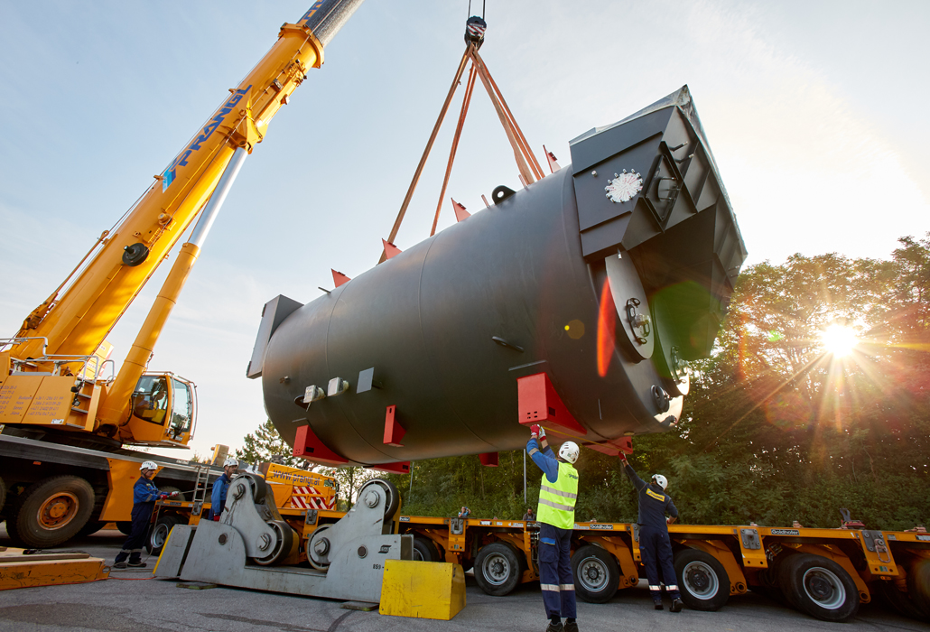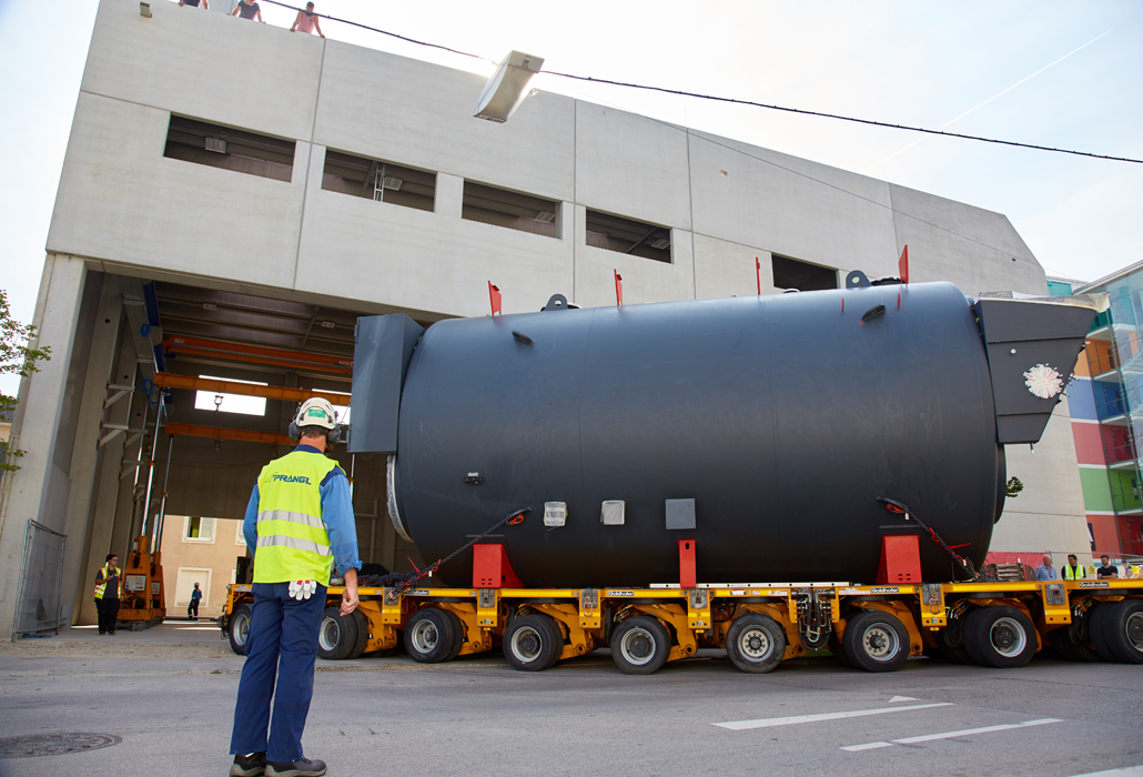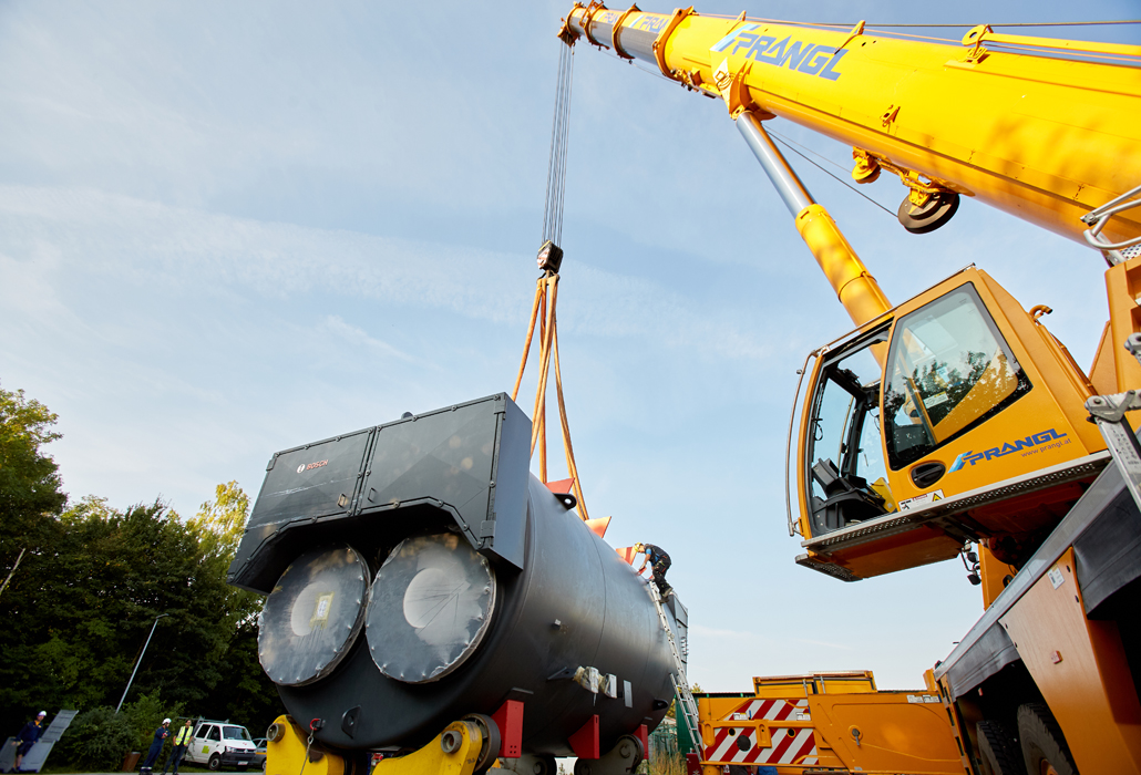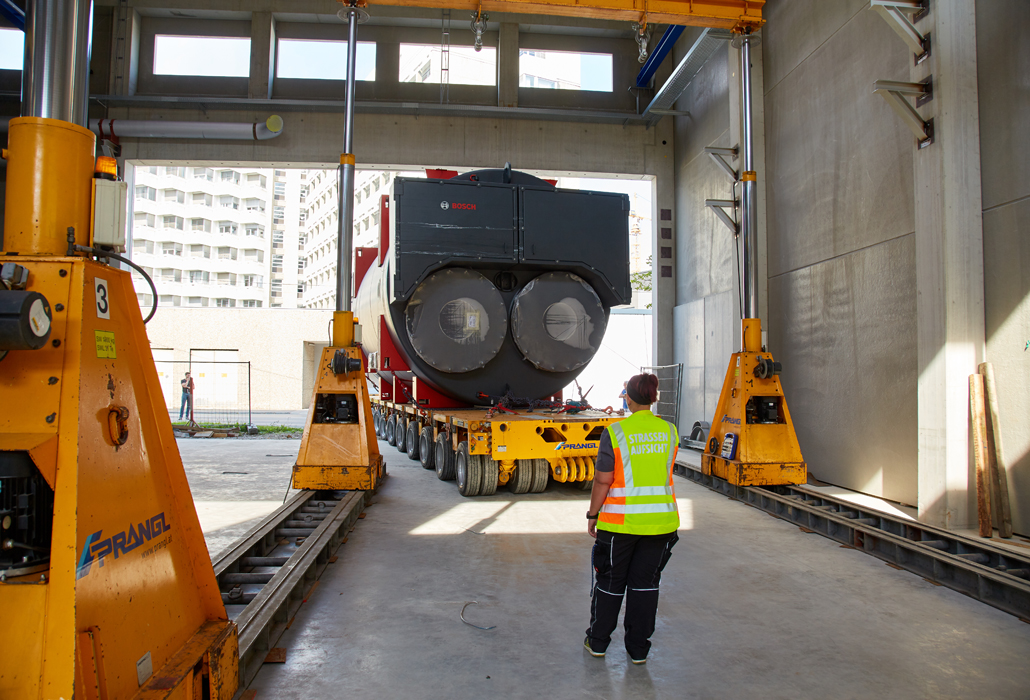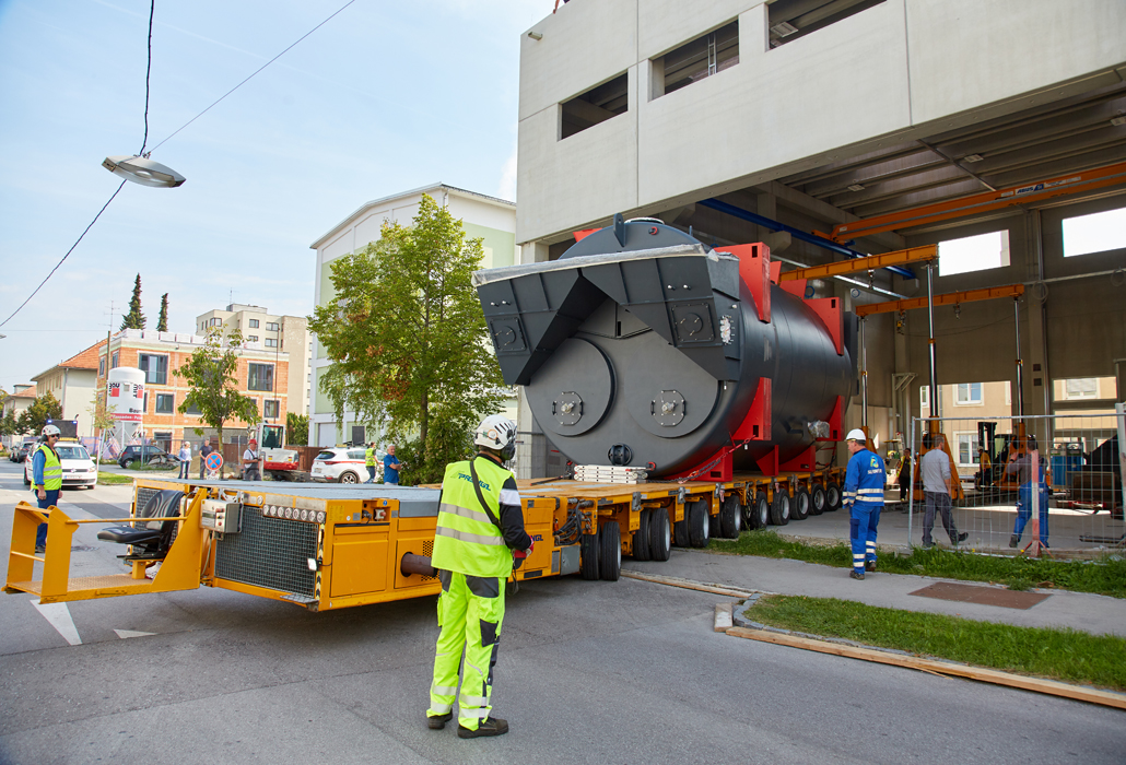 Z dokončanjem v hali so strokovnjaki podjetja Prangl ponovno izjemno demonstrirali zasnovo "Vse iz ene roke". Od natovarjanja prek cestnega prevoza do namestitve s posebnimi stroji je podjetje Prangl pokrivalo celotno logistiko. Hitro se je podjetje pri procesu načrtovanja osredotočilo na alternativne možnosti vnašanja opreme. Kot kompaktno in močno orodje za dviganje je prišel v poštev le hidravlični dvižni portal PHP 63. Zadnji metri do končnega položaja so bili premagani s pomočjo viličarjev in težkih valjarjev. Sodobna tehnologija ne samo pri pridobivanju energije temveč tudi na poti do cilja.