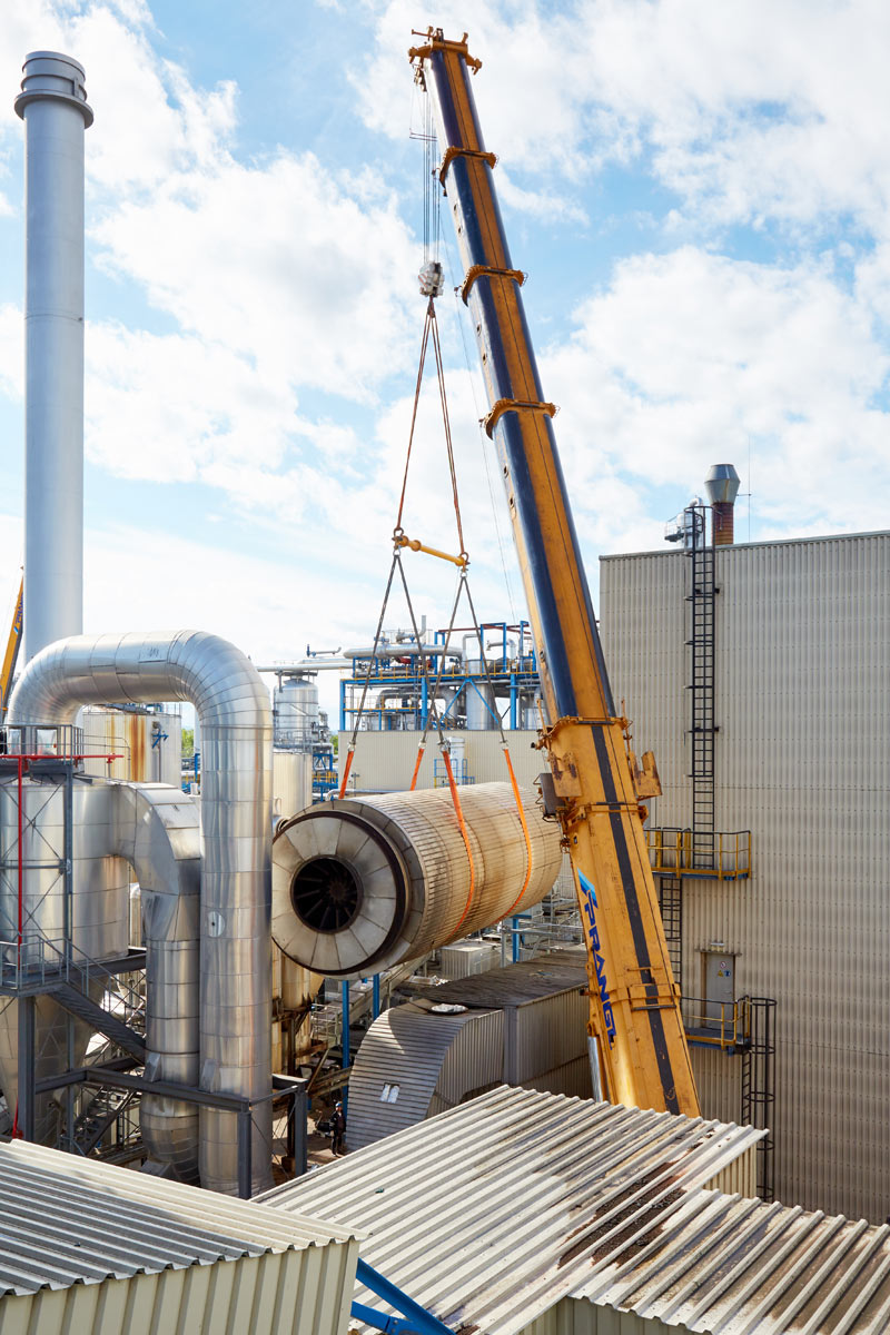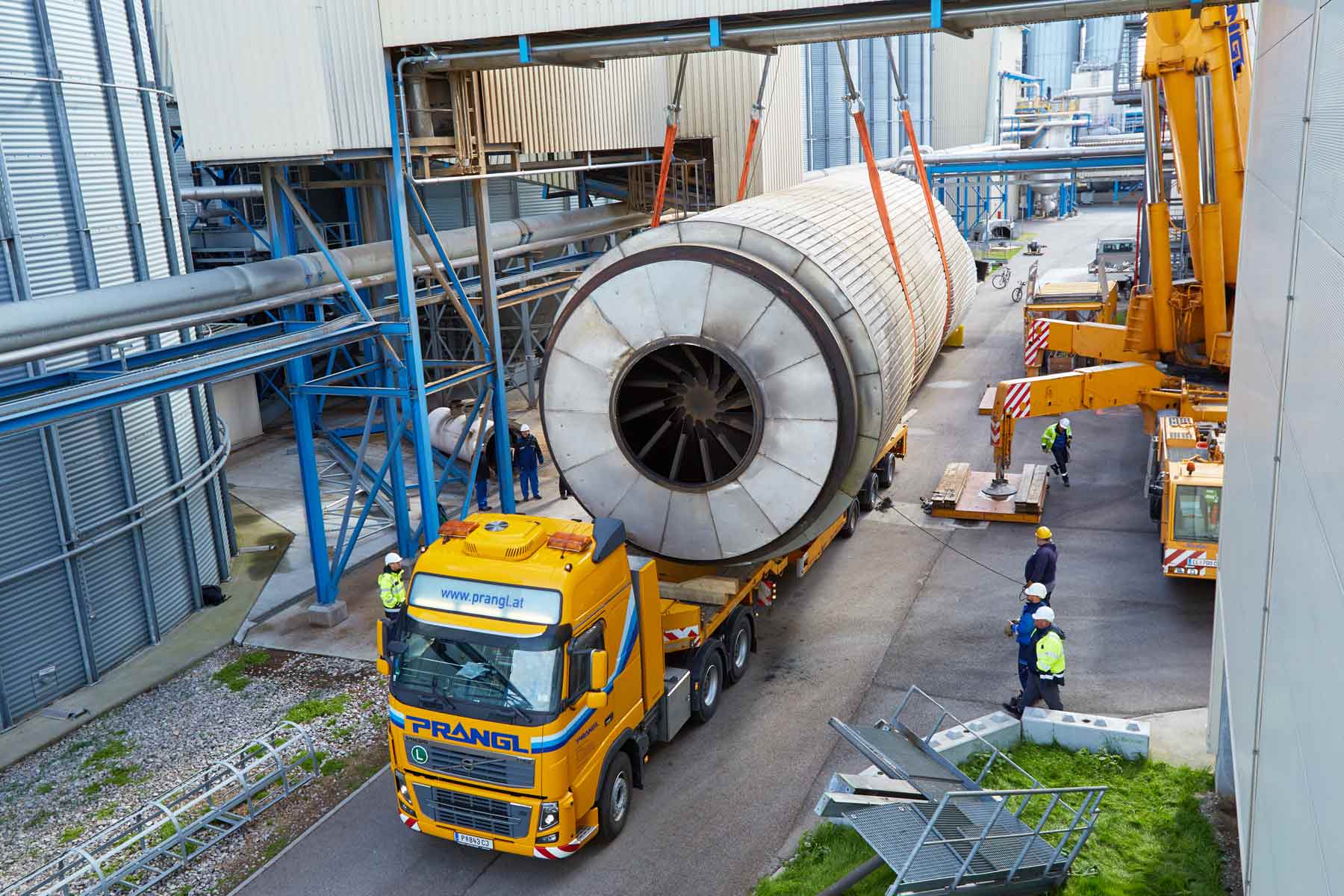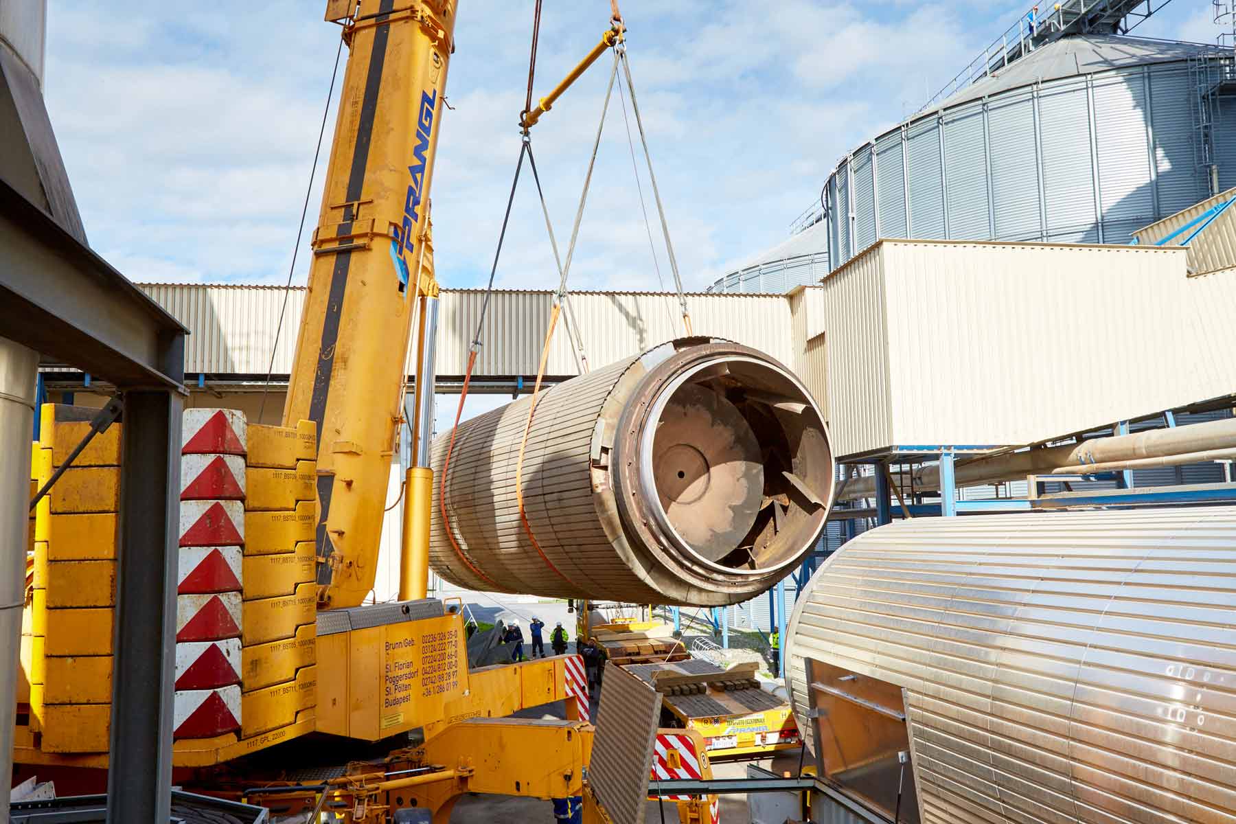 Stari bobnasti sušilnik smo kar z velikim dvigalom naložili na Pranglov polpriklopnik in ga znotraj območja tovarne premaknili za 200 m. Od tod ga je teleskopsko dvigalo nosilnosti 200 t dvignilo in odstavilo na mestu, predvidenem za nadaljnji odvoz. Dan potem smo nov, prav tako 51 t težak bobnasti sušilnik previdno dvignili in namestili na njegovo delovno mesto, da je bilo spet mogoče ponovno vzpostaviti prejšnje stanje obrata.