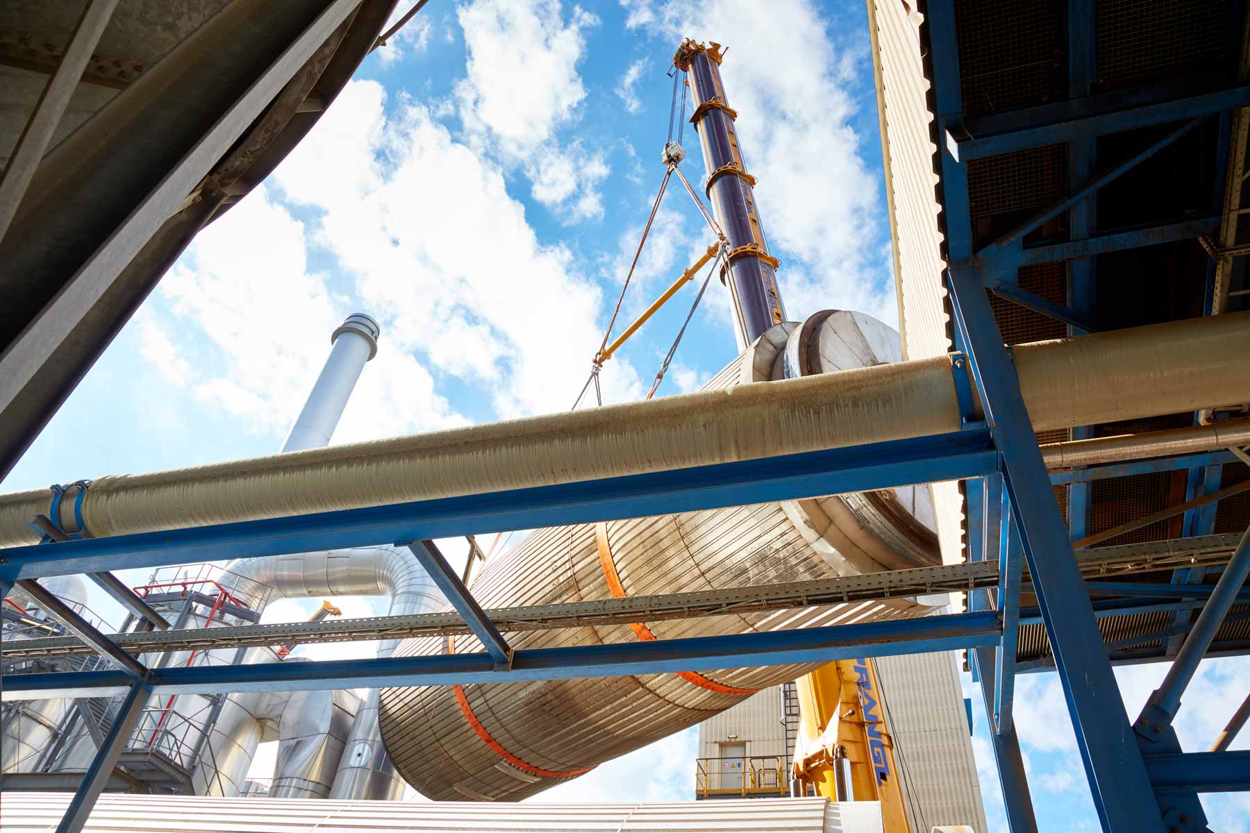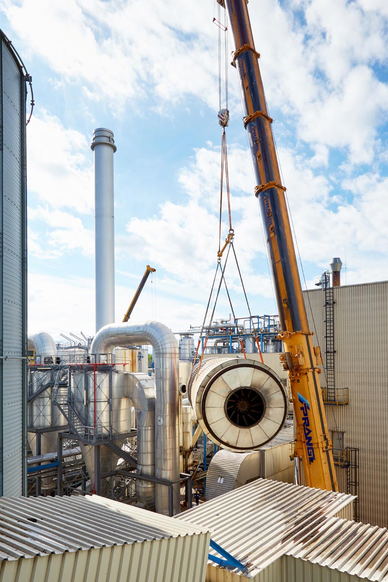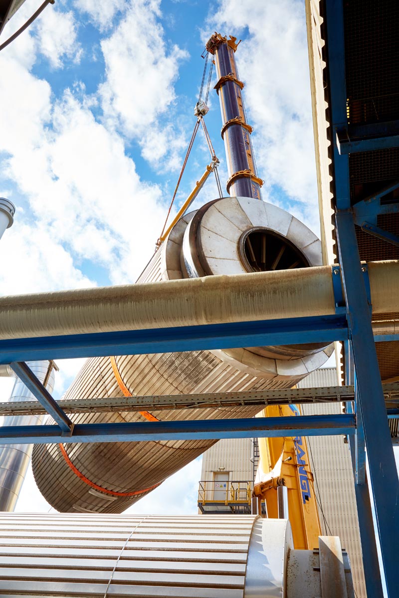 Stari bobnasti sušilnik smo kar z velikim dvigalom naložili na Pranglov polpriklopnik in ga znotraj območja tovarne premaknili za 200 m. Od tod ga je teleskopsko dvigalo nosilnosti 200 t dvignilo in odstavilo na mestu, predvidenem za nadaljnji odvoz. Dan potem smo nov, prav tako 51 t težak bobnasti sušilnik previdno dvignili in namestili na njegovo delovno mesto, da je bilo spet mogoče ponovno vzpostaviti prejšnje stanje obrata.