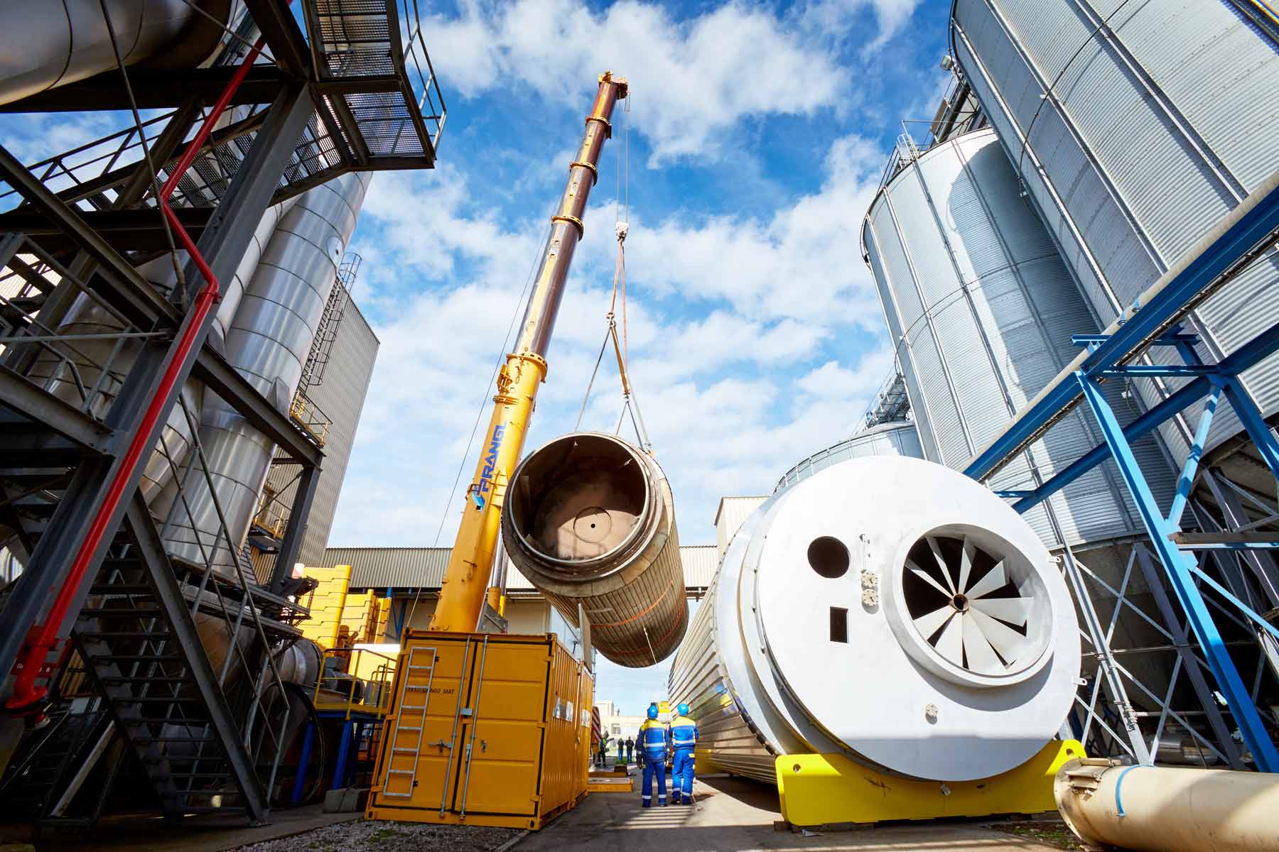 Z do deset stroji naenkrat je družba Prangl podpirala vzdrževalna dela v tovarni Agrana. Pri dvižnih delih na različnih območjih tovarne bioetaola sta sodelovali teleskopski dvigali nosilnosti 60 t in 70 t. Za podporo pri delu pa smo uporabili viličarje, zglobne, stebrne in škarjaste dvižne delovne ploščadi z upravljalnim osebjem.