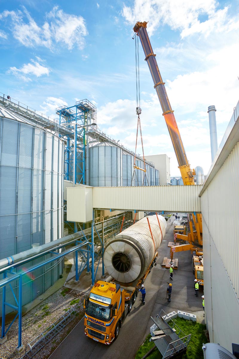 Na območju tovarne Agrana je imela družba Prangl kaj delati. Glavni razlog za letošnje mirovanje obrata je bila gotovo težavna zamenjava 51-tonskega bobnastega sušilnika. V ožinah med obstoječimi stavbami smo morali sušilnik dvigniti in na njegovo mesto postaviti novega. Z dobrim načrtovanjem in natančnim delom upravljavcev dvigal sta ta dva kočljiva dviga potekala popolno.