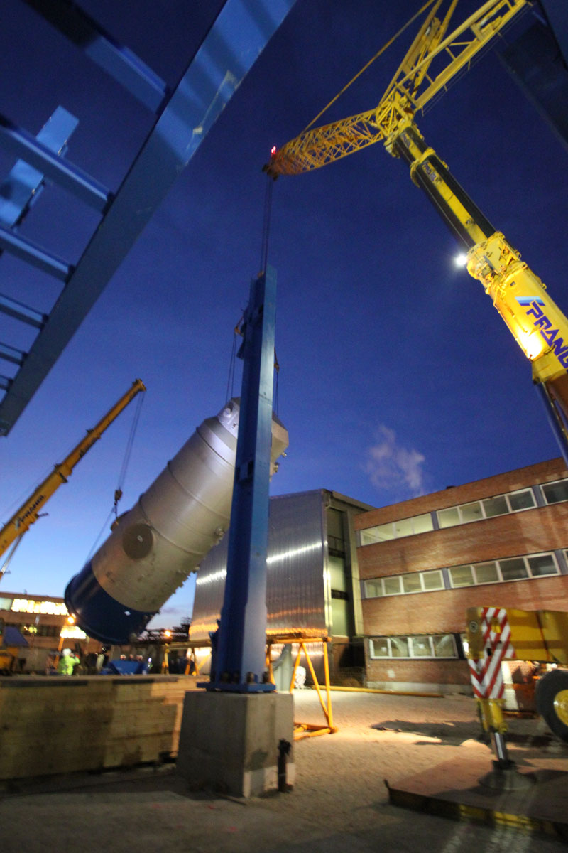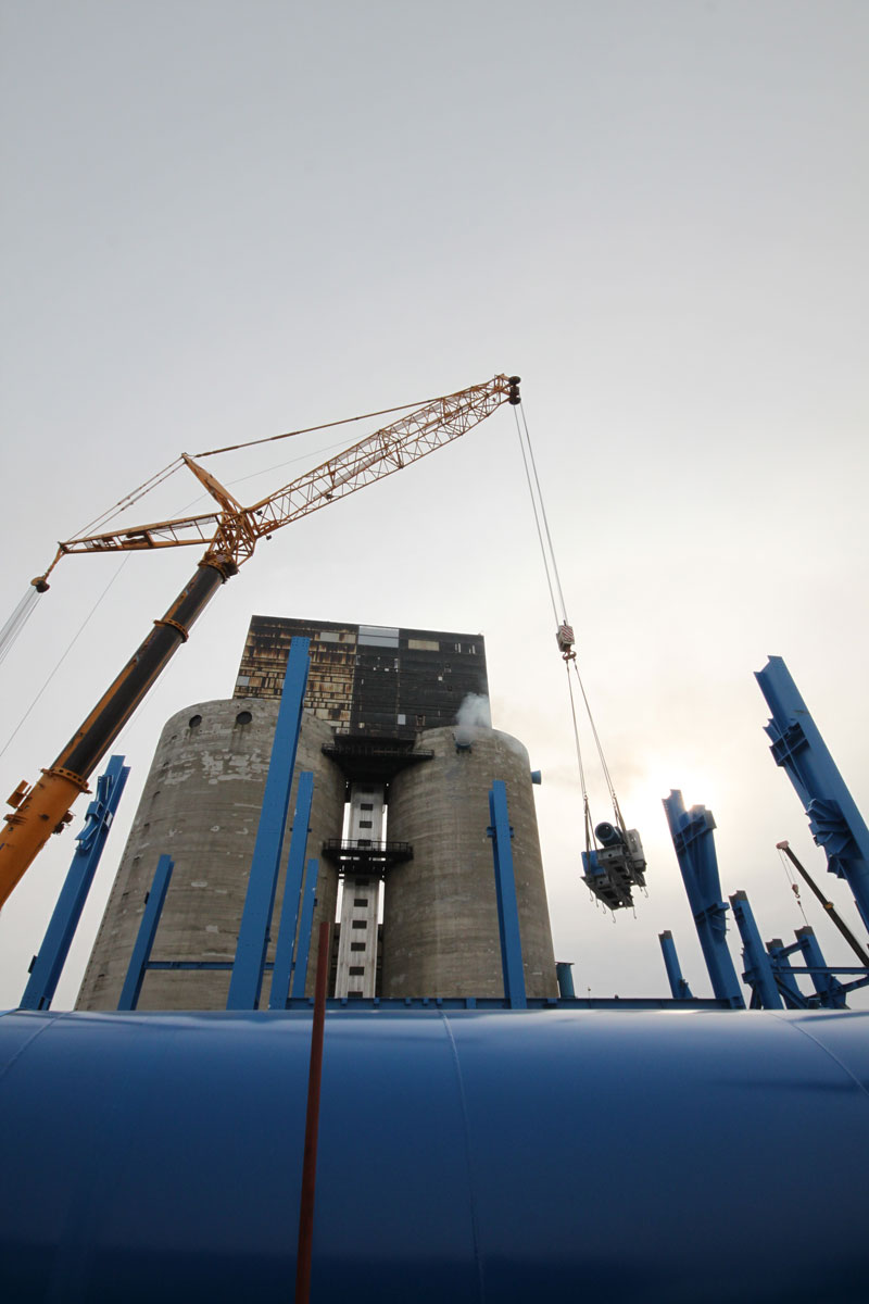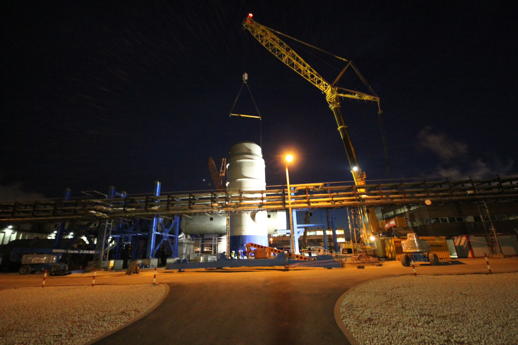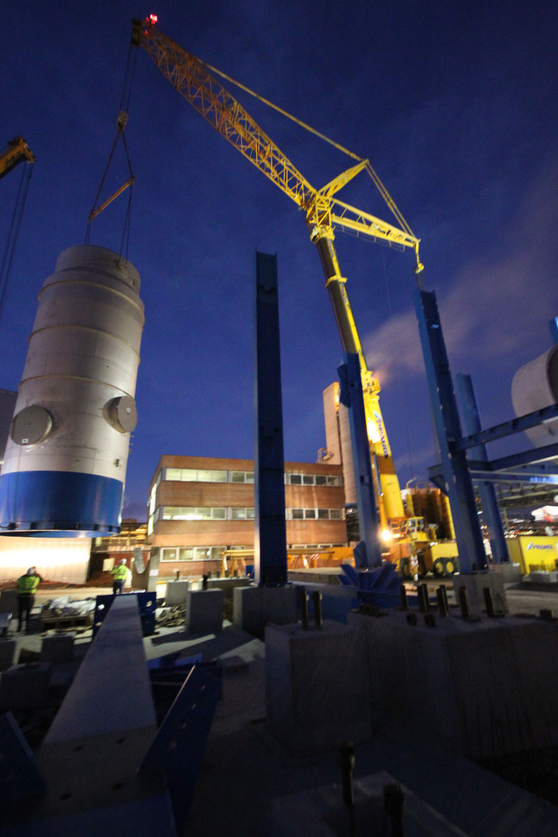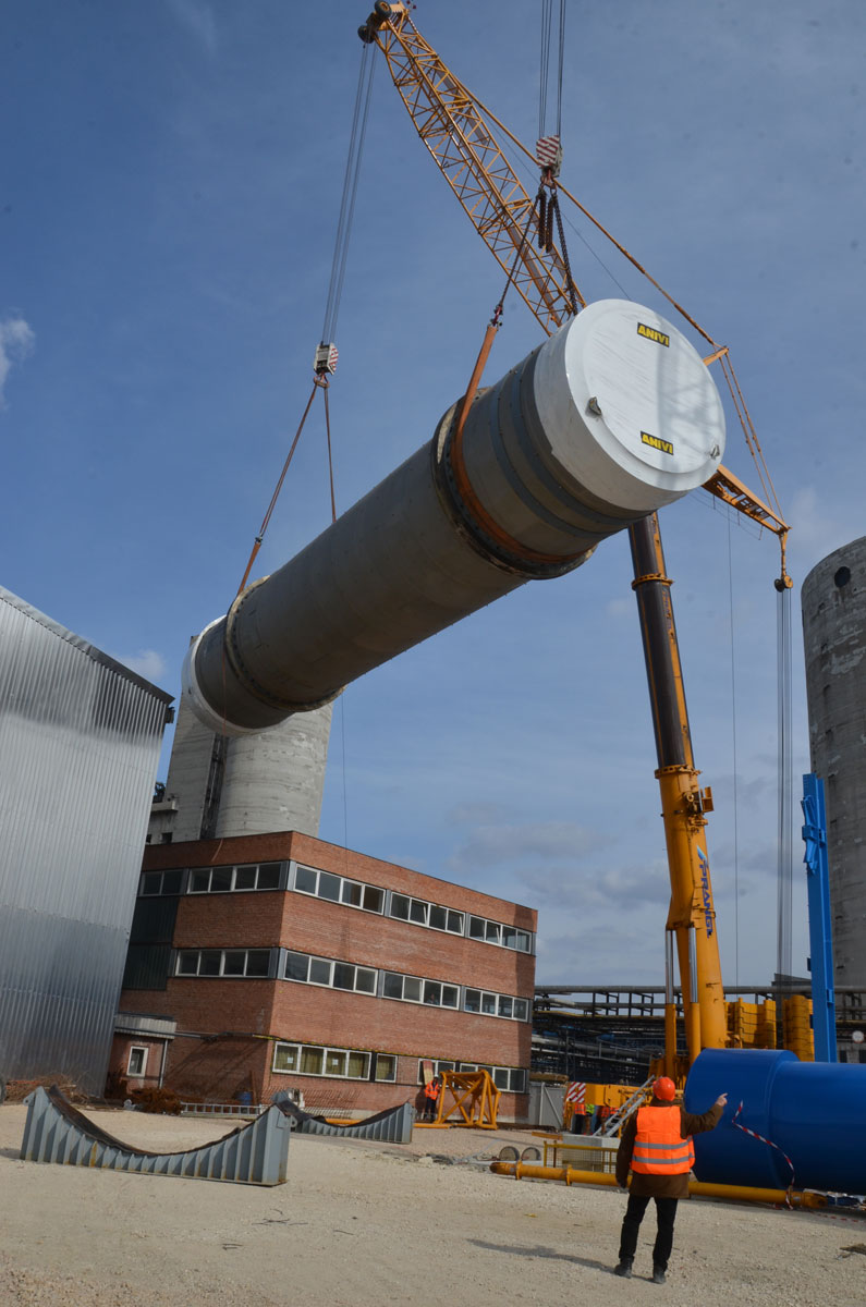 Sušilnik smo v vodoravnem položaju dvignili in namestili v tandemu dveh teleskopskih dvigal nosilnosti 500 t in 700 t. Prav tako z dvema mobilnima dvigaloma smo premestili čistilni element: teleskopski dvigali nosilnosti 500 t in 700 t sta element dvignili in odložili na predvidenem mestu. Nekaj pomožnih dvigov, kot npr. namestitev podnožja dimnika idr., smo izvedli z omenjenim 500-toncem.