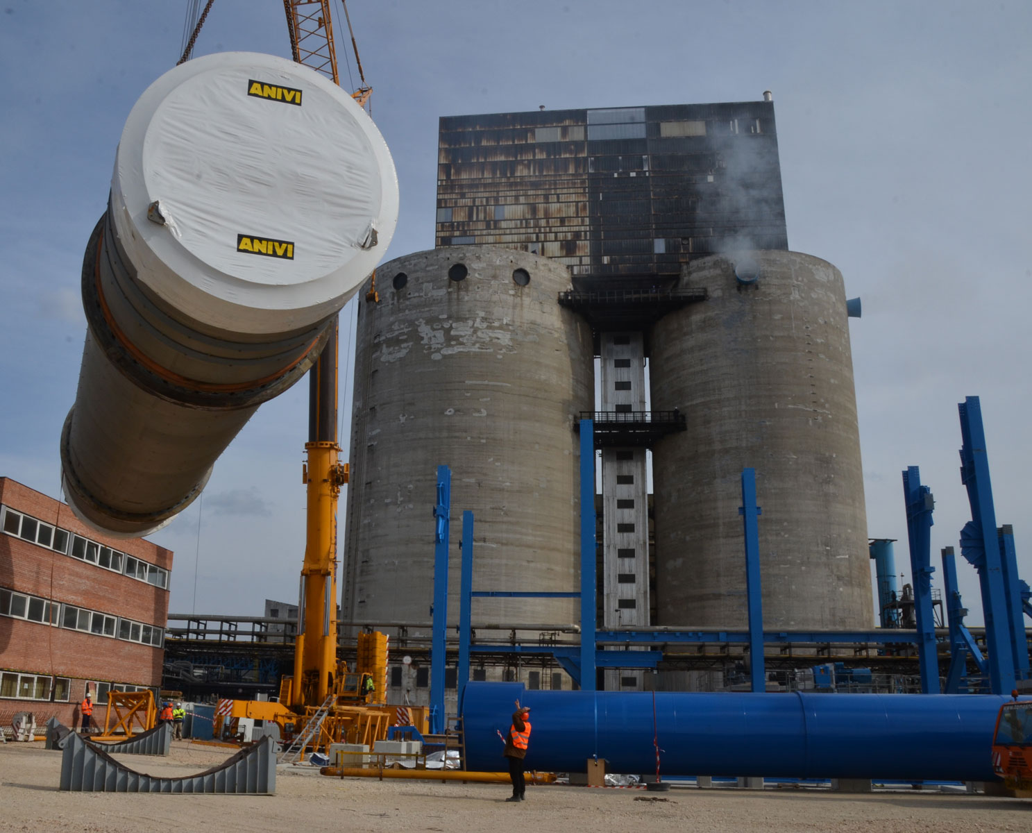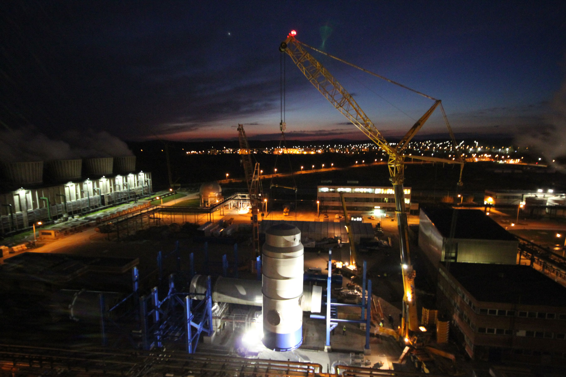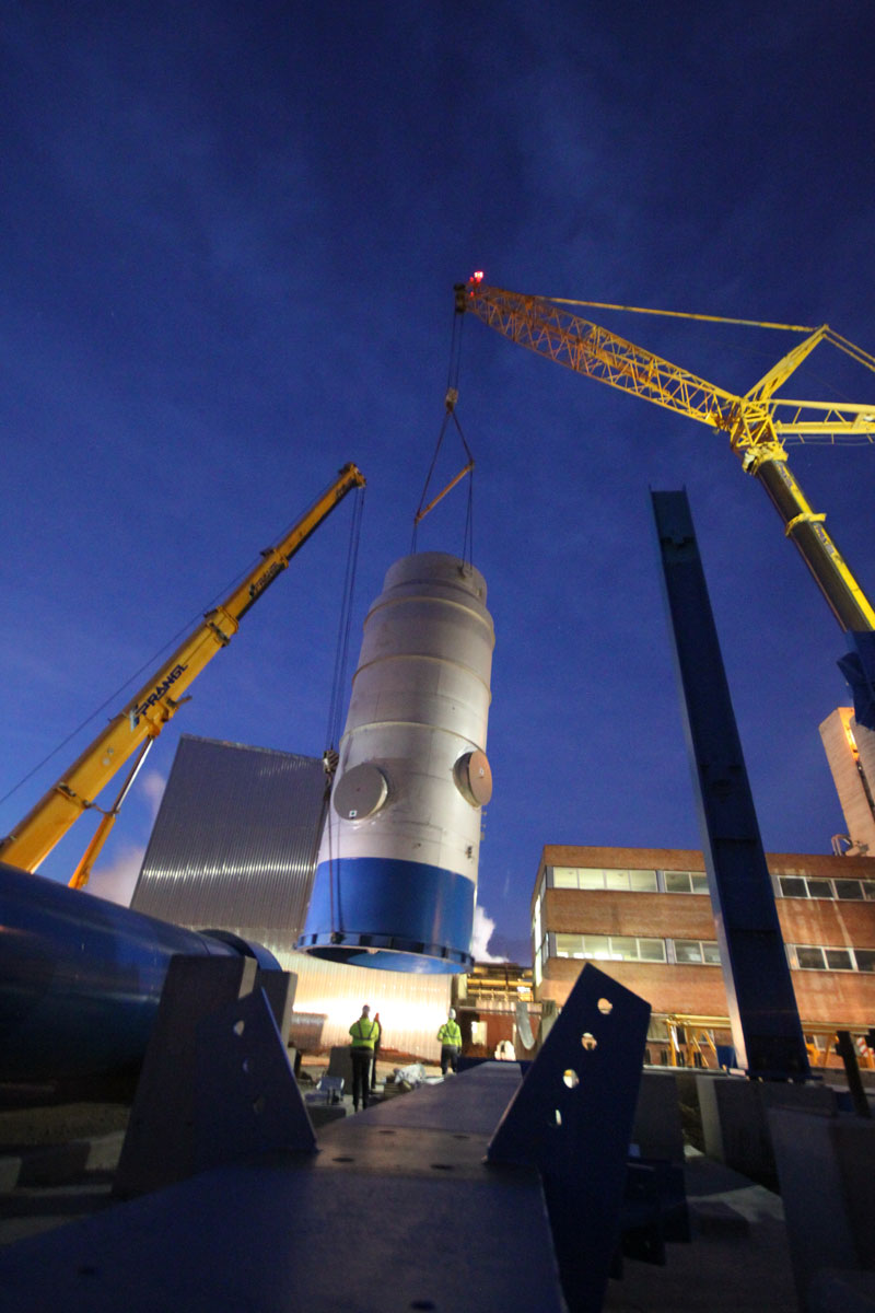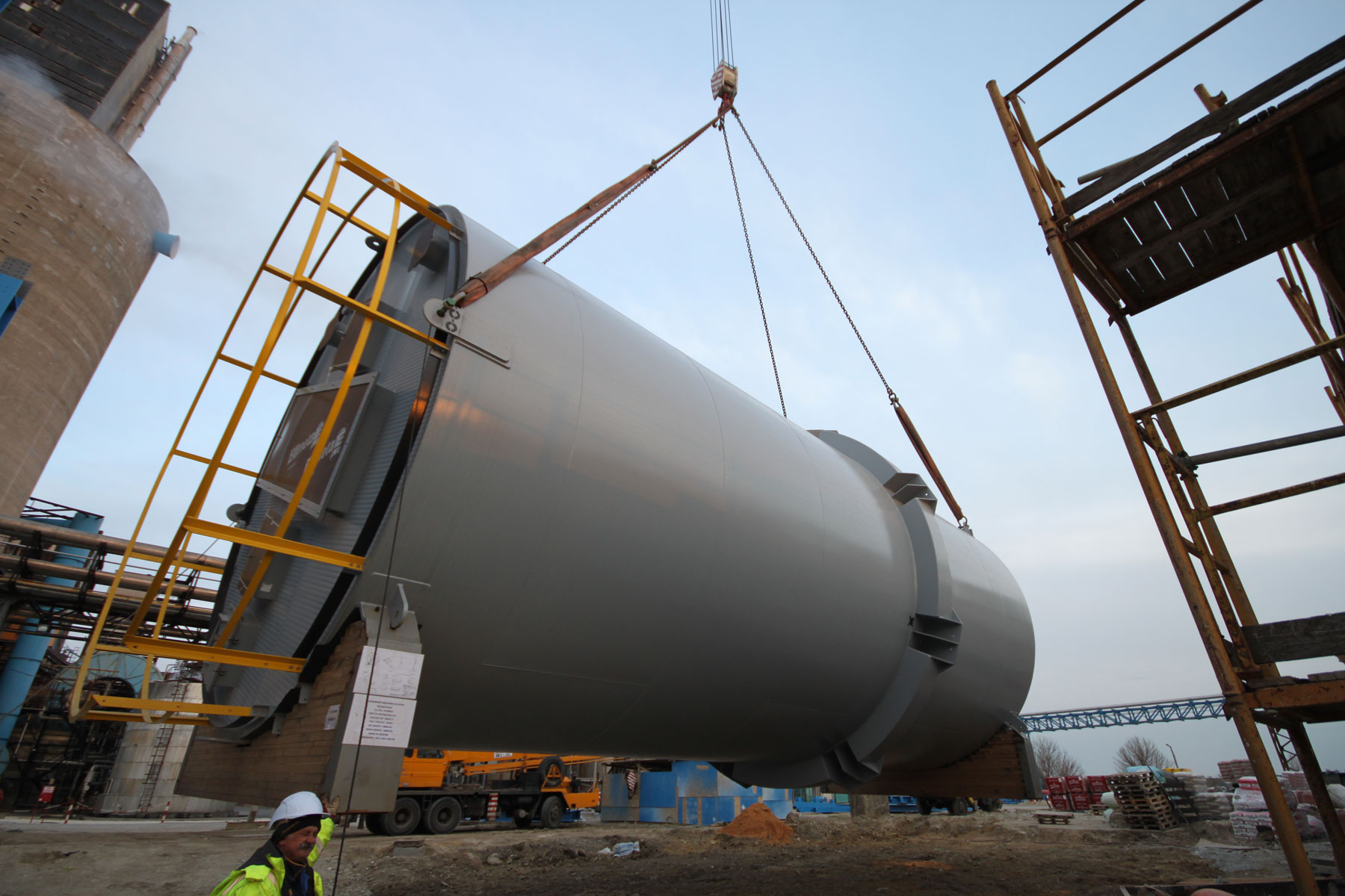 Sušilnik smo v vodoravnem položaju dvignili in namestili v tandemu dveh teleskopskih dvigal nosilnosti 500 t in 700 t. Prav tako z dvema mobilnima dvigaloma smo premestili čistilni element: teleskopski dvigali nosilnosti 500 t in 700 t sta element dvignili in odložili na predvidenem mestu. Nekaj pomožnih dvigov, kot npr. namestitev podnožja dimnika idr., smo izvedli z omenjenim 500-toncem.