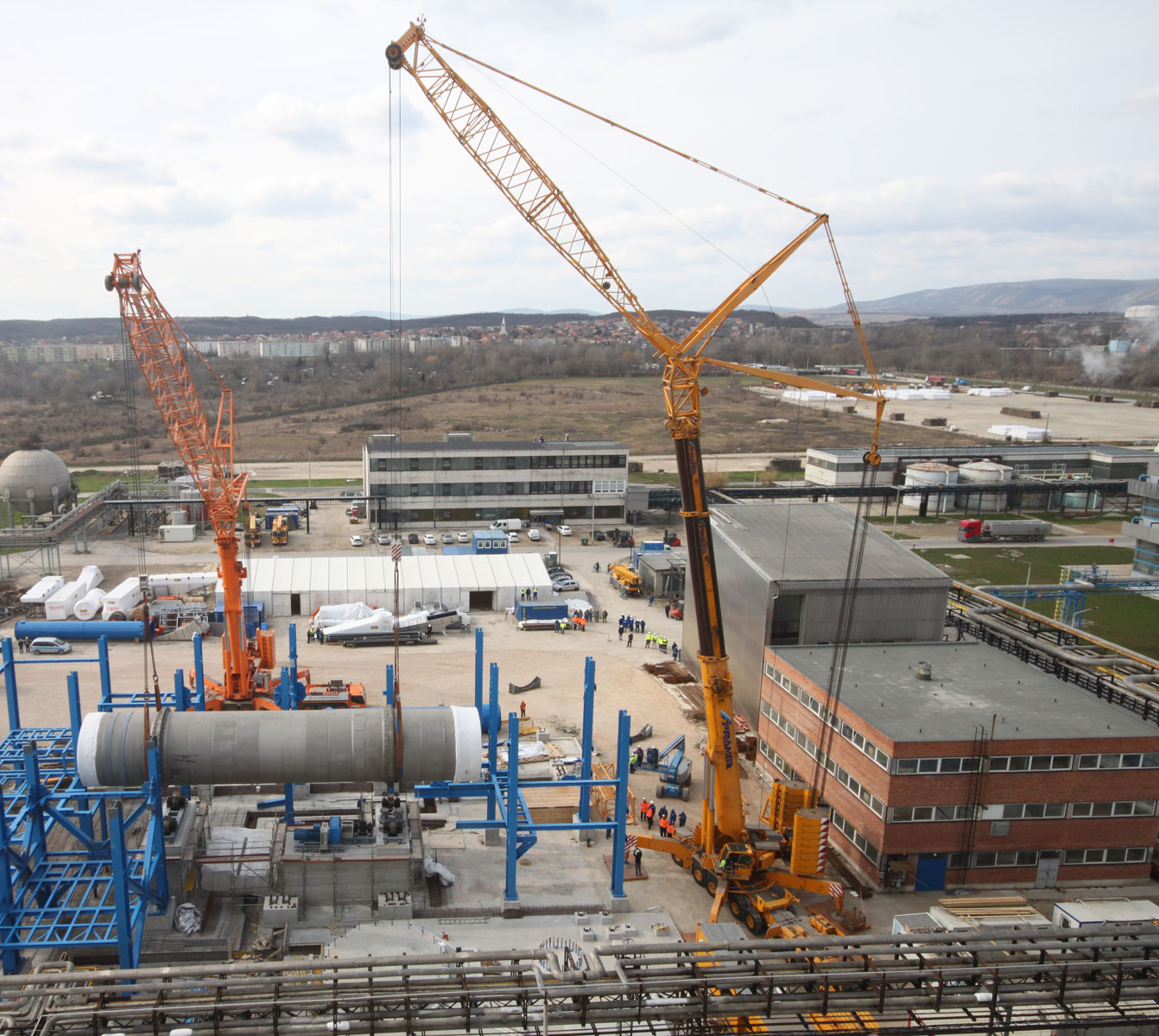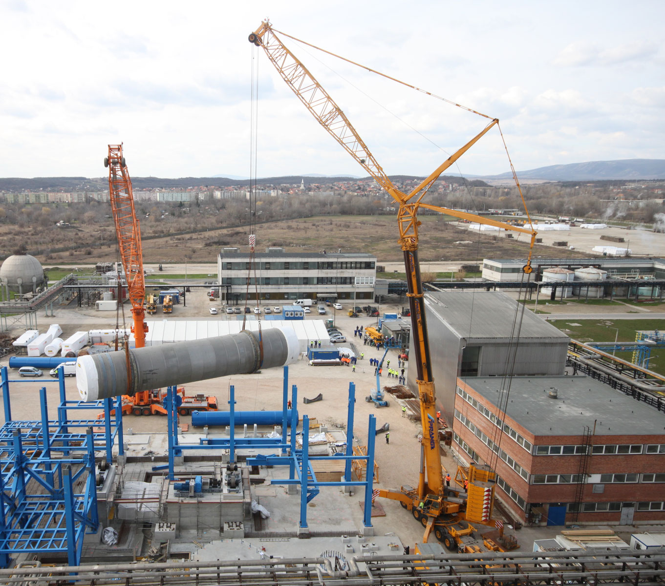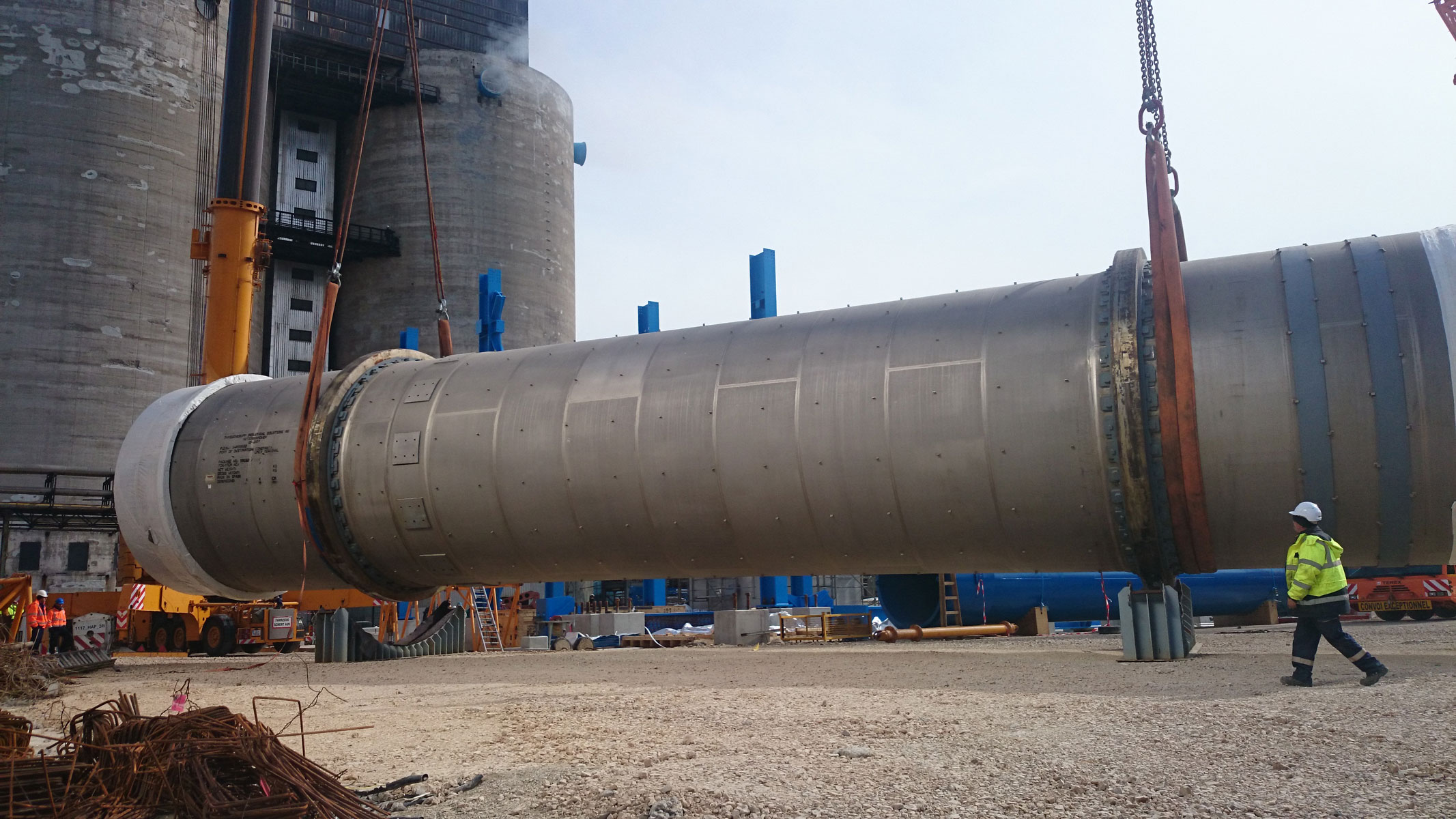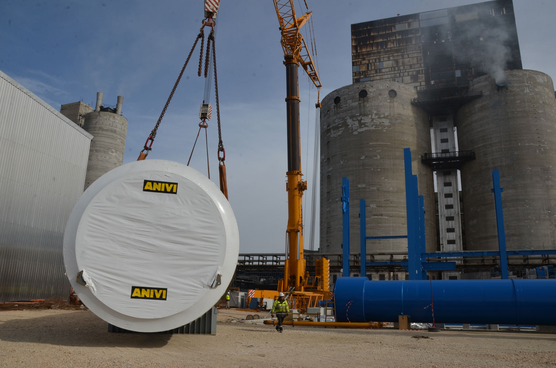Sušilnik smo v vodoravnem položaju dvignili in namestili v tandemu dveh teleskopskih dvigal nosilnosti 500 t in 700 t. Prav tako z dvema mobilnima dvigaloma smo premestili čistilni element: teleskopski dvigali nosilnosti 500 t in 700 t sta element dvignili in odložili na predvidenem mestu. Nekaj pomožnih dvigov, kot npr. namestitev podnožja dimnika idr., smo izvedli z omenjenim 500-toncem.