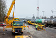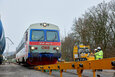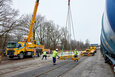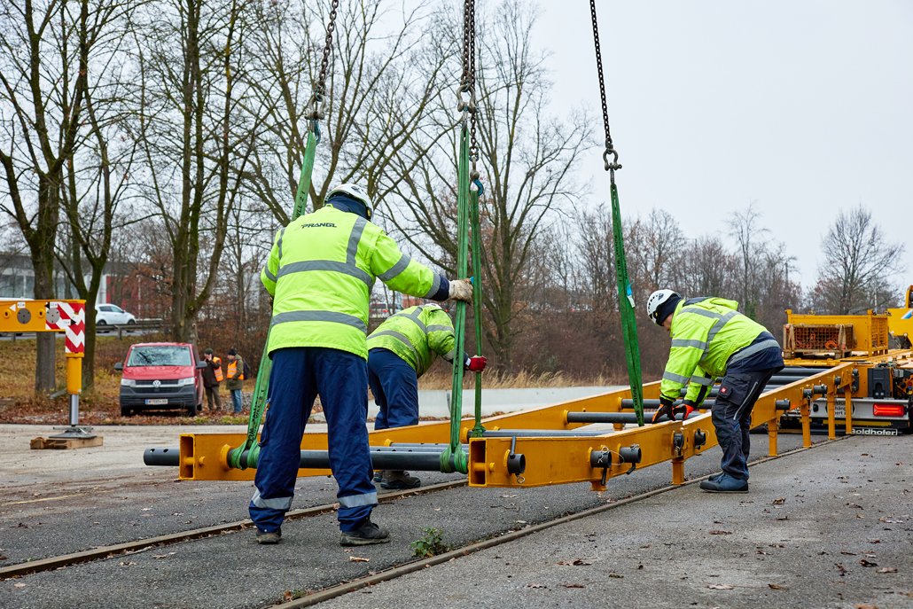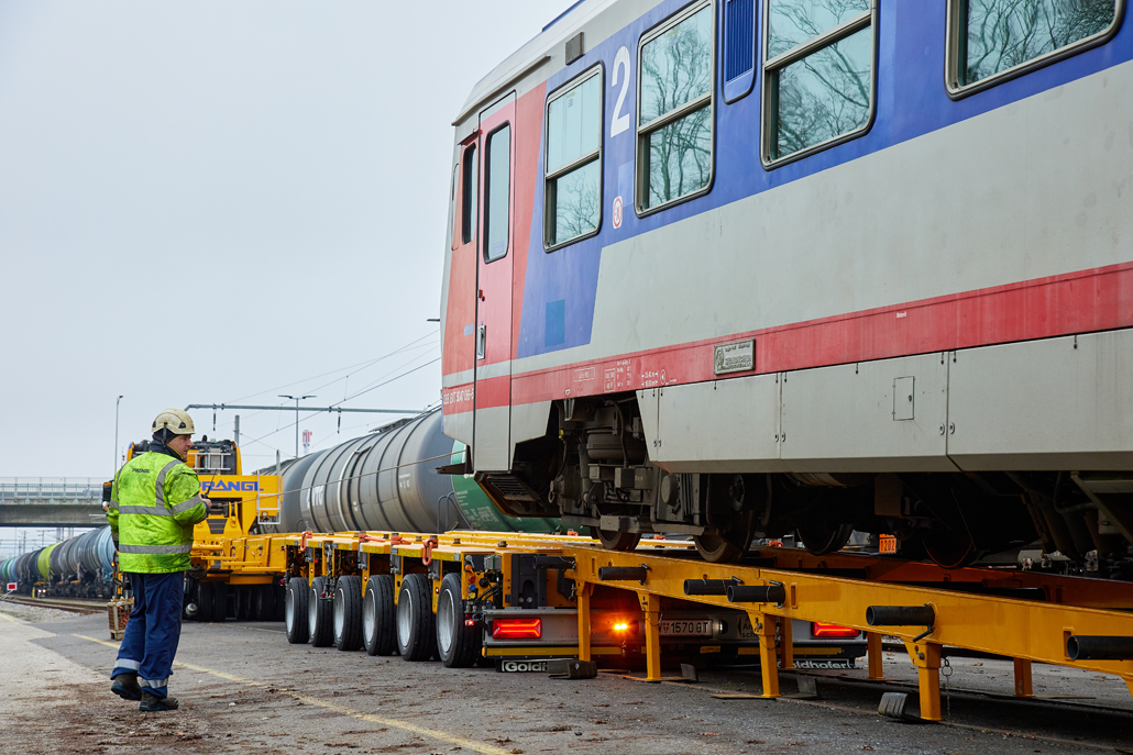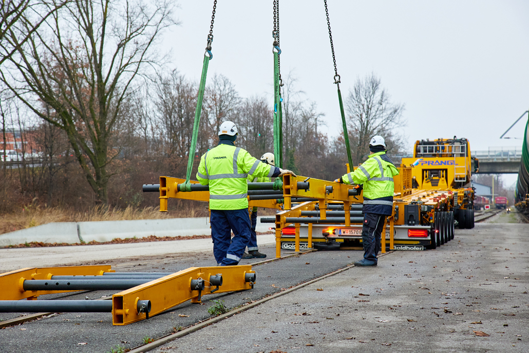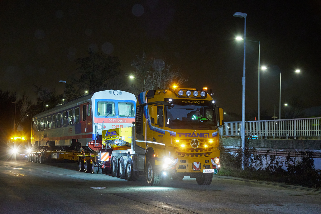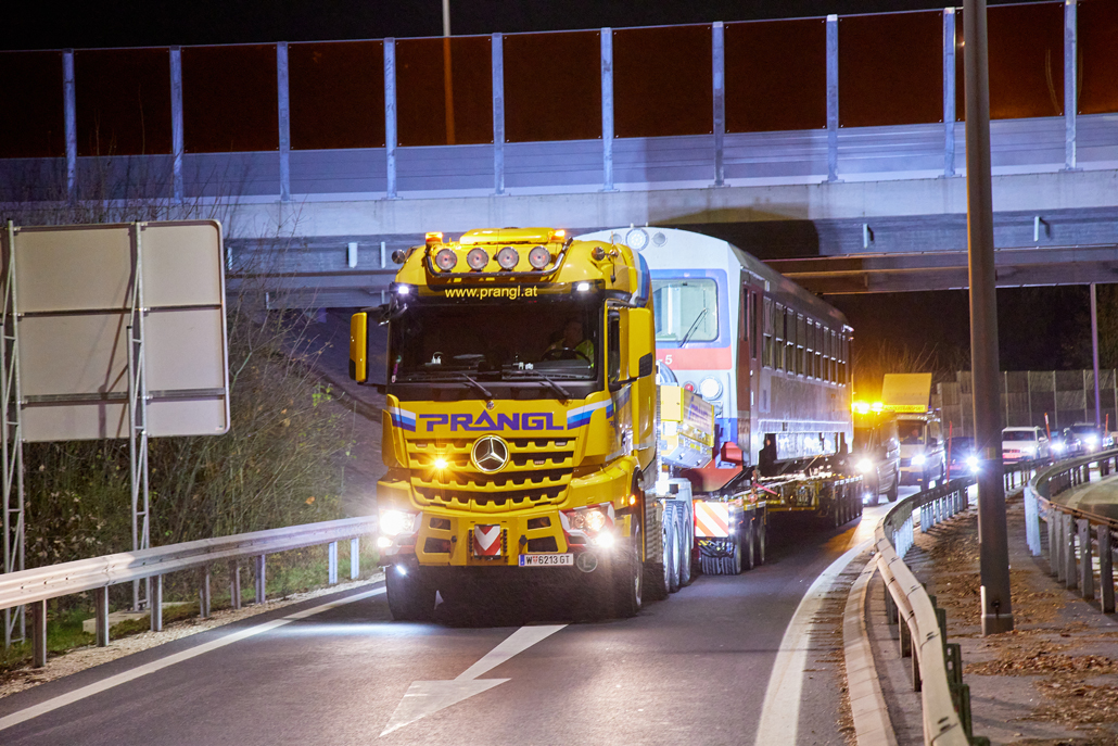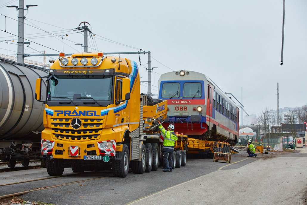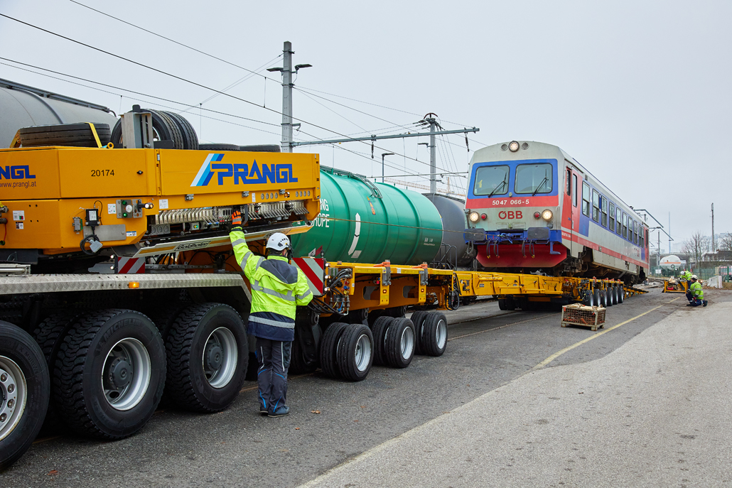 Podjetje Prangl je tudi v tem primeru ponudilo rešitev: prevoz po cesti z 4-osnim težkim transportnim vozilom skupaj s posebnim 9-osnim transporterjem za železniška vozila. Dela so se začela opoldne: za natovarjanje vlaka s tirnega sistema na transporter je bila potrebna posebna naložna rampa, sestavljena iz več elementov. Deli so bili predhodno dostavljeni z 4-osnim transportnim vozilom in so že čakali v mestnem pristanišču. Vsak element je ekipa Prangl prestavila in sestavila s 50-tonskim mobilnim dvigalom, pri čemer je upoštevana omejitev dviga in vrtenja zaradi nadzemne električne napeljave.