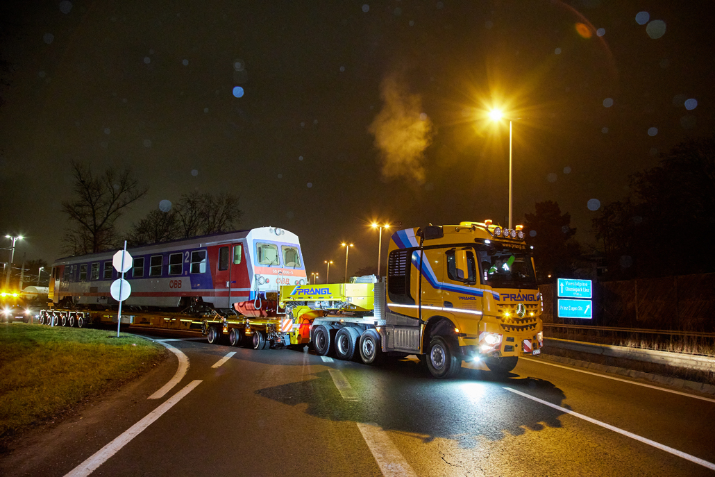 58-tonski vagon ÖBB je bilo treba prepeljati od pristanišča Linz do železniške postaje Mühlkreis Linz Urfahr. Toda kako to izvesti, če med obema postajama ni nobene železniške povezave? To je izziv, ki ga specialist, kot je Prangl, z veseljem sprejme.