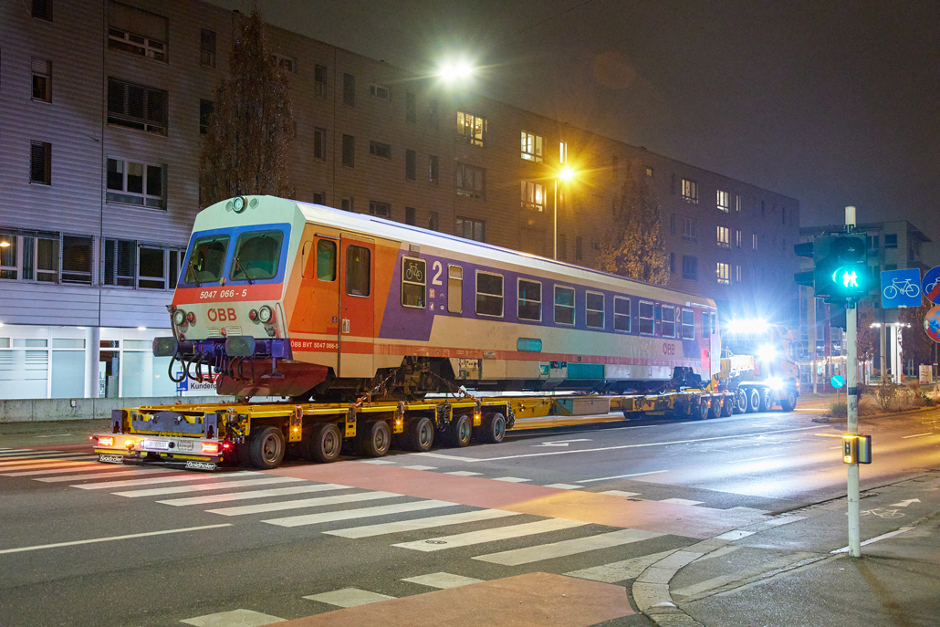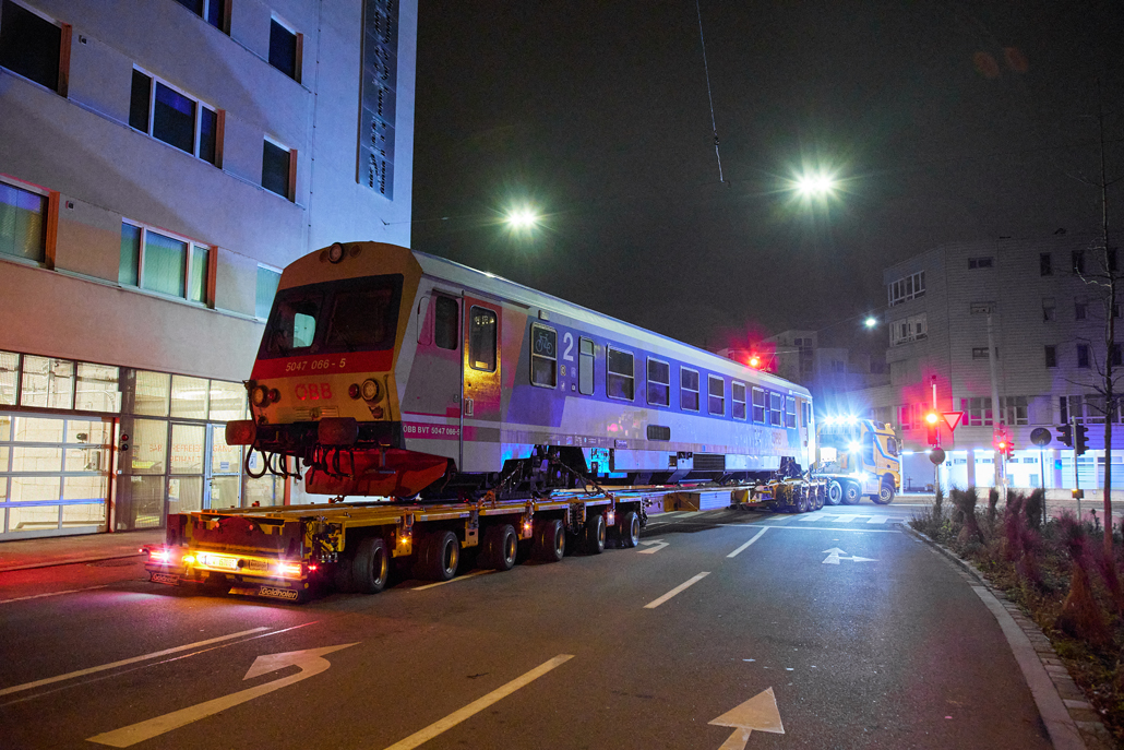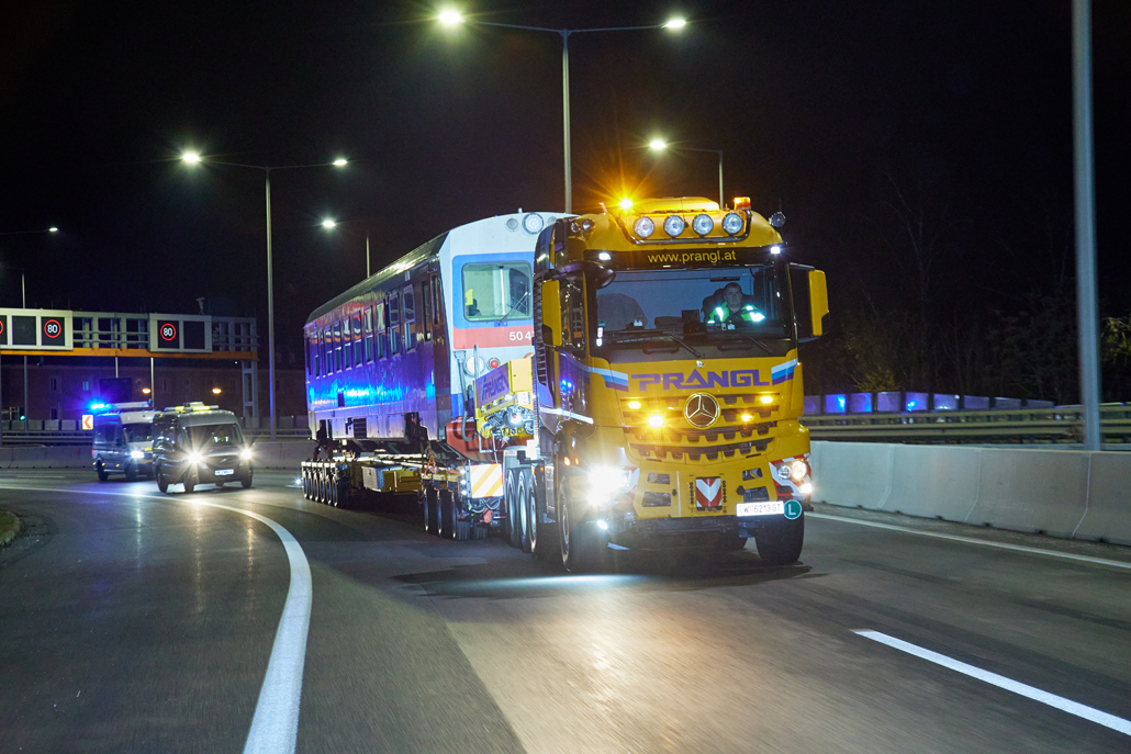Potovanje skozi središče Linza ponoči je bilo zaradi velikih dimenzij transportnega vozila zahtevno. Spremljevalna vozila so morala večkrat zapreti odseke ceste, da bi omogočila varen prehod – pogosto na nasprotnem voznem pasu. Najzahtevnejši del pa se je izkazal za zadnji odsek. Da bi voznik transporterja spravil vlak nazaj na tire, je moral vzvratno prevoziti približno 320 metrov dolg odsek ceste. To je bilo spretno izvedeno, vlak pa je bil nato na namembnem mestu raztovorjen preko pripravljene rampe.