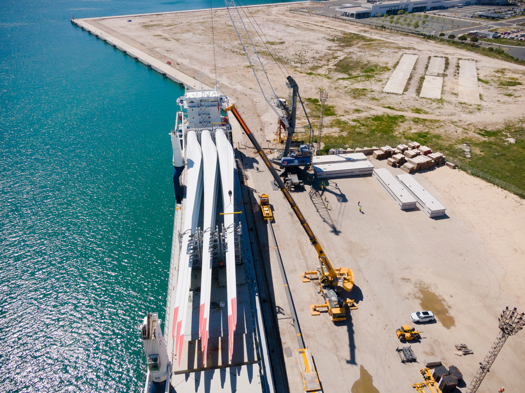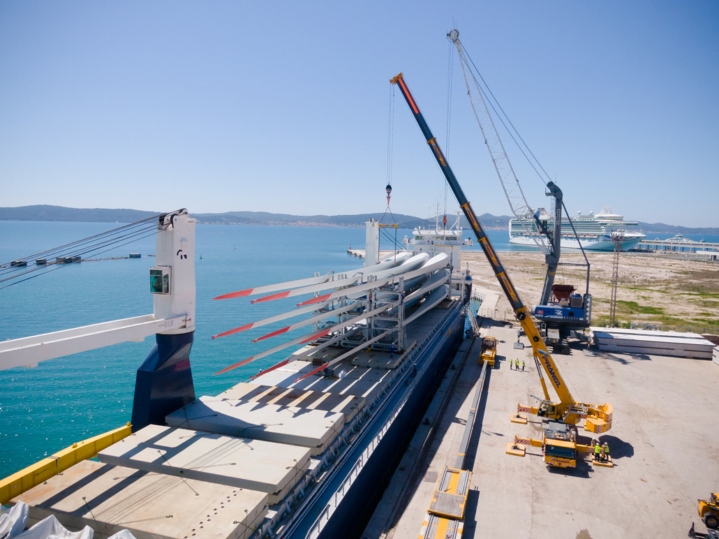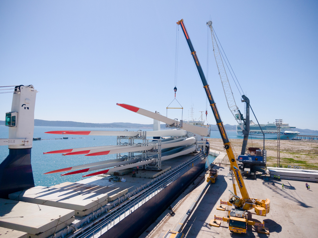 Razklad ladje je bil izveden s pomočjo dveh teleskopskih dvigal s kapacitetama 130 in 250 ton. Najtežje komponente so tehtale 65 ton, najdaljše so bile lopatice rotorja z 72 metri. Pranglovi težki transporterji so bili v pristanišču pripravljeni za prevzem tovora: 5-osni vlačilci ali 4-osni vlačilci so bili glede na obremenitev opremljeni z različno posebno opremo. Uporabljeni so bili 9-osni polpriklopniki, modularne prikolice, prikolice z lopaticami, stolpni adapterji in teleskopske prikolice z žlicami.