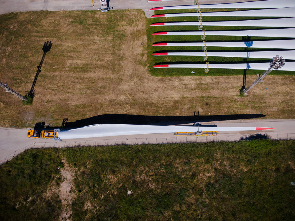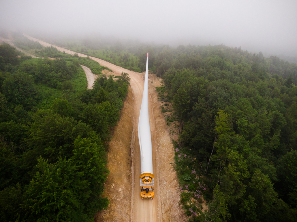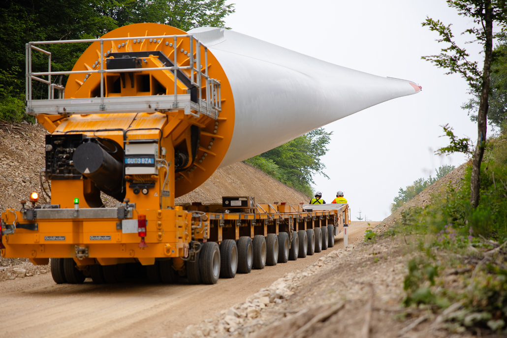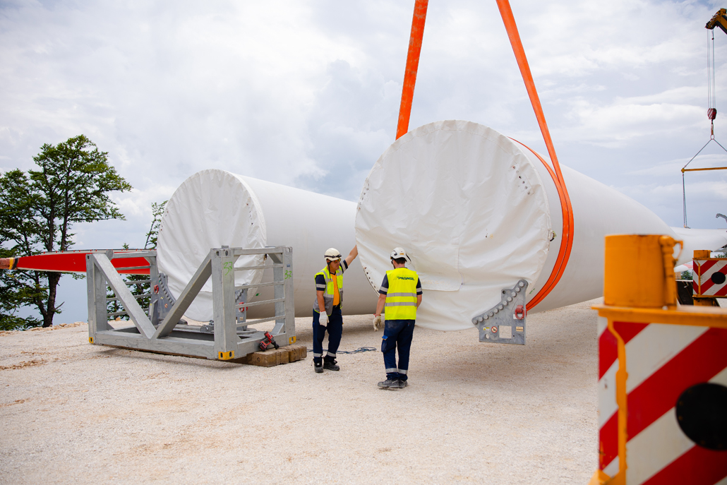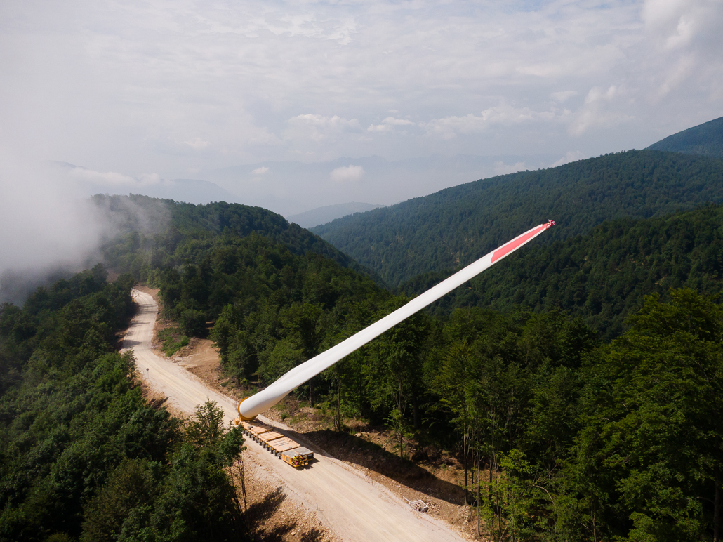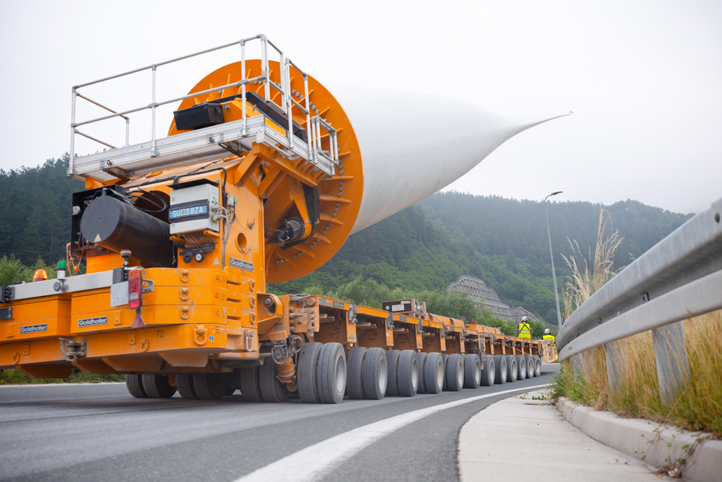 Ob vznožju gore je bilo zato urejeno pretovorno mesto s skladiščnimi prostori za pretovarjanje sestavnih delov vetrnih turbin na ustrezna vozila z uporabo dveh mobilnih teleskopskih dvigal (110 in 130 ton): rotorske lopatice na samohodne težke module s posebno napravo za prevoz lopatic, delne sekcije stolpa pa na 4-osne vlačilce z lastnimi modularnimi priklopniki. Po osmih kilometrih zelo zahtevne vožnje v gorah so vse dele postopoma raztovorili z mobilnim dvigalom s kapaciteto 160 ton in mobilnim dvigalom s kapaciteto 250 ton.