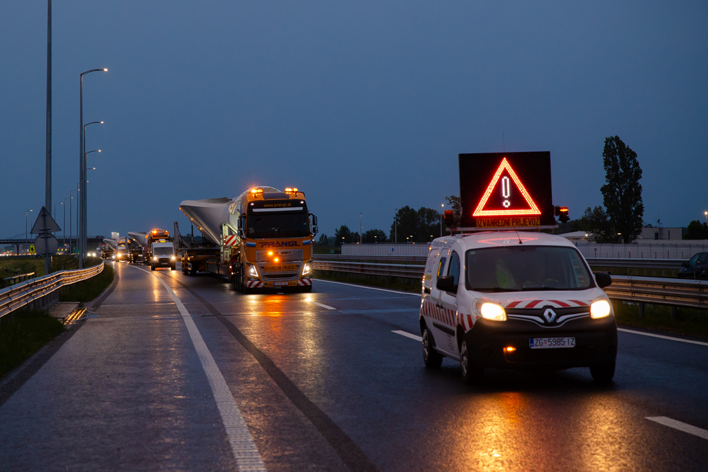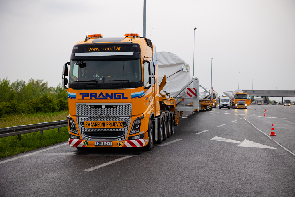 Za varen promet je bilo treba poskrbeti tudi po hrvaški avtocesti. Na dveh mestih je bila popolna zapora in preusmeritev na nasprotni pas. V Bosni so bila potrebna gradbena dela, da bi lahko potovali po progi. Skupno je bilo 13 transportov na turbino, da so vse komponente pripeljane na cilj. Vsak transportni vlak je bil na poti skupaj štiri noči – dve na Hrvaškem in dve v BiH. Vendar zaradi do 20-odstotnih naklonov težka tovorna vozila niso mogla dostaviti tovora neposredno na gradbišče na koncu trase.