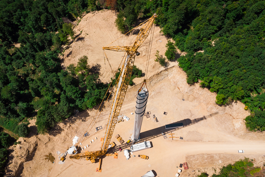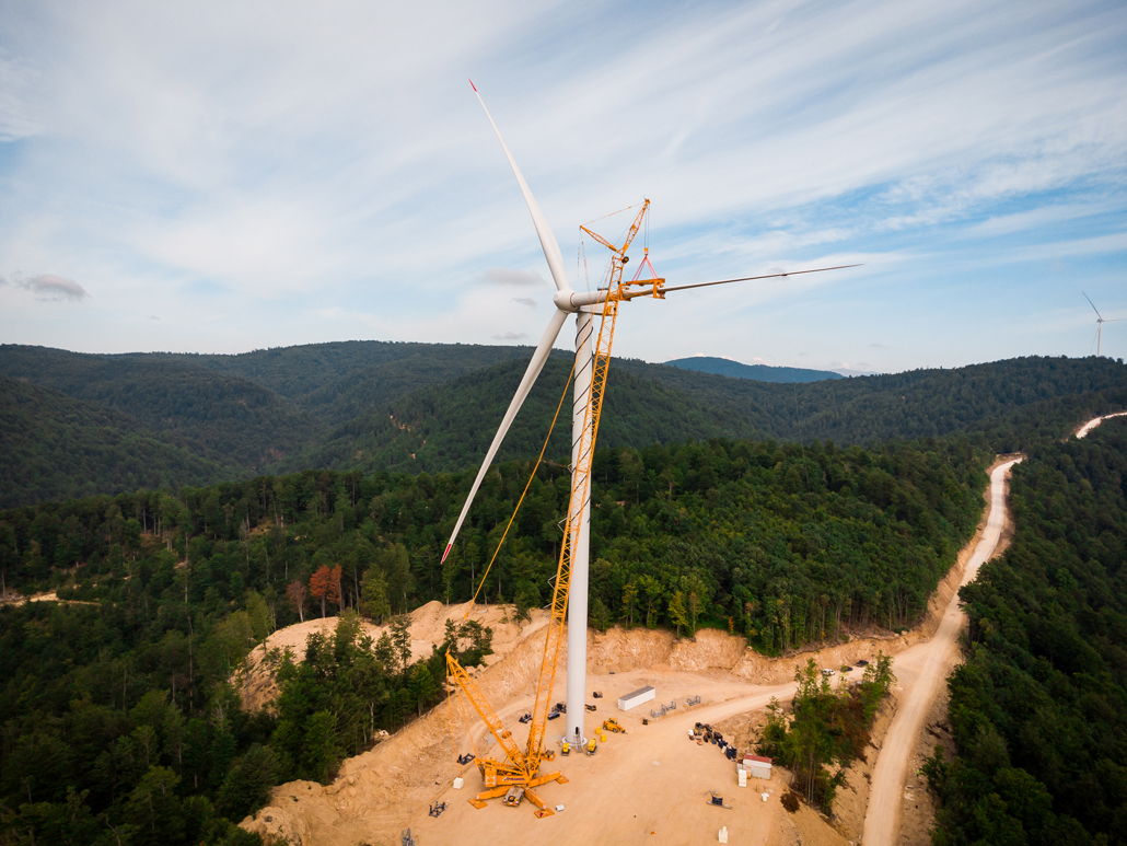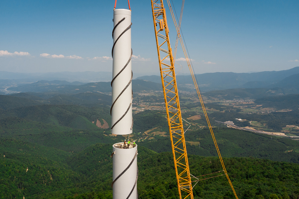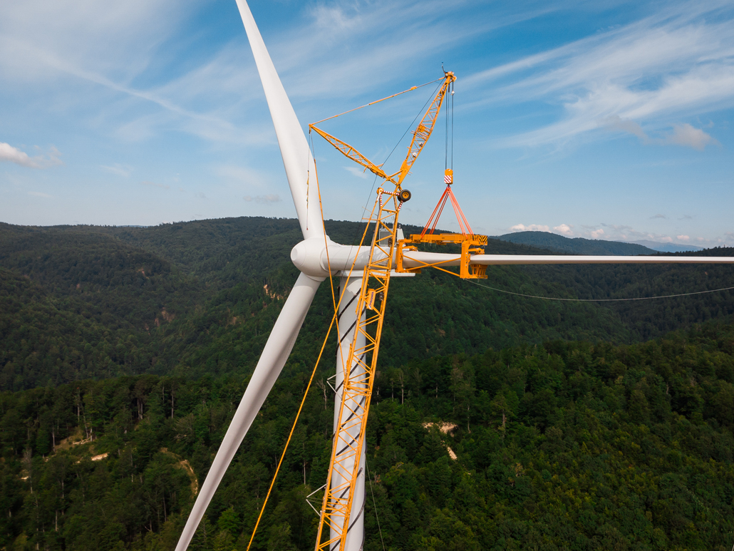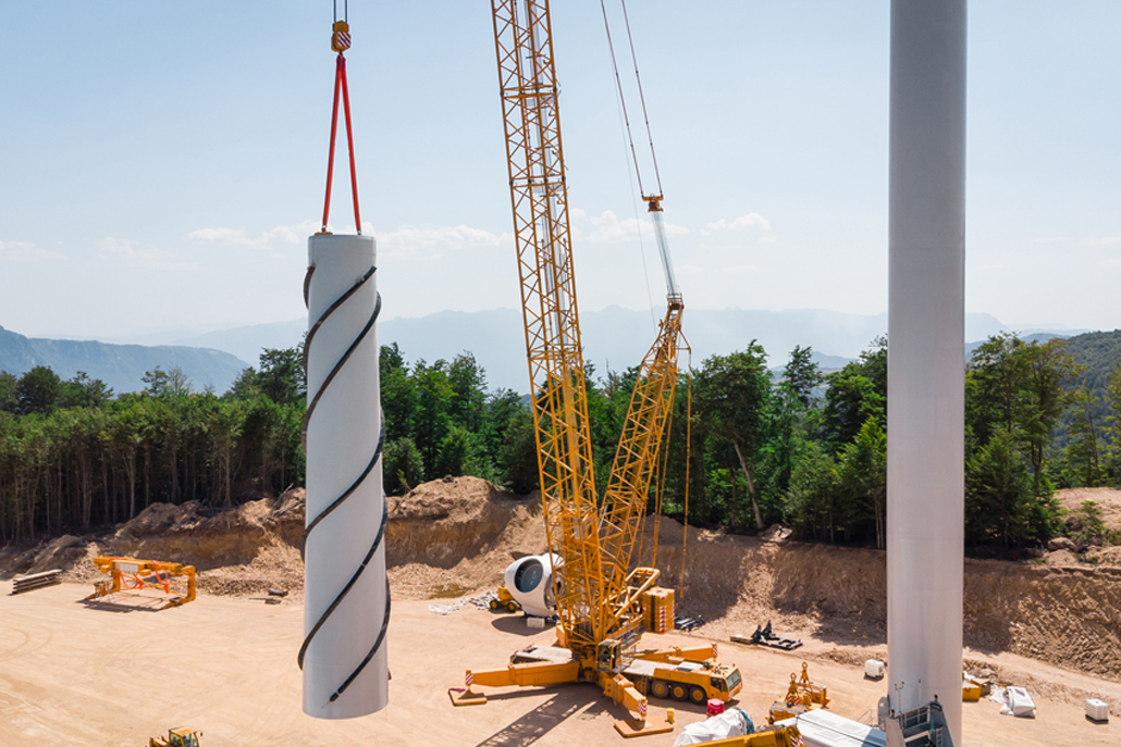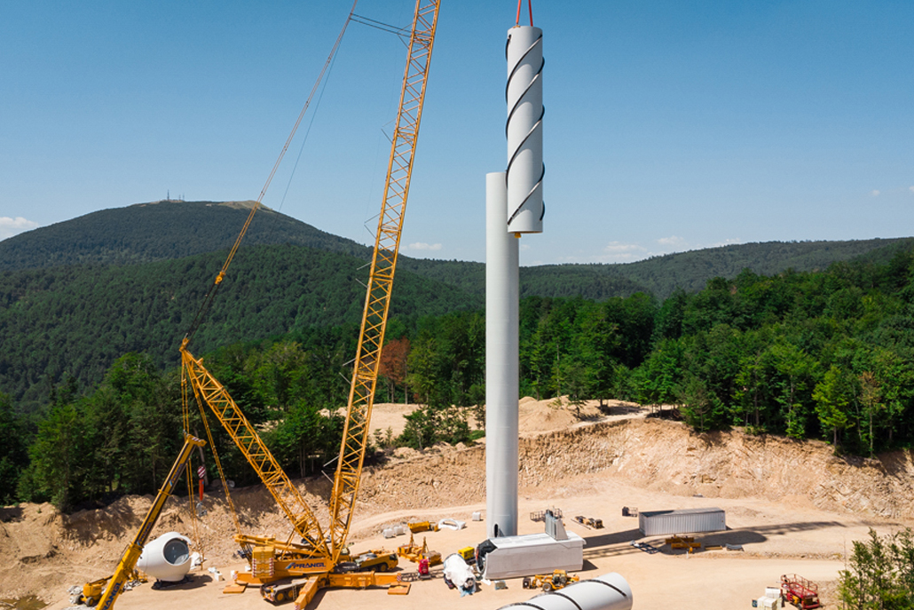Nato se je lahko začela zahtevna montaža turbin. Različne komponente so bile najprej vnaprej nameščene s 500-tonskim in 250-tonskim teleskopskim dvigalom. Sledila je montaža dveh delov stolpa, ki so ju nato dvignili na svoje mesto in trdno zasidrali s 600-tonskim dvigalom z rešetkasto roko ter 160-tonskim teleskopskim dvigalom v tandemskem dvigu. Preostali trije segmenti stolpa so bili vnaprej sestavljeni na tleh, nato pa dvignjeni na svoje mesto, s čimer je bil stolp vetrne turbine dokončan. S tem je bilo vse pripravljeno za naslednji korak.