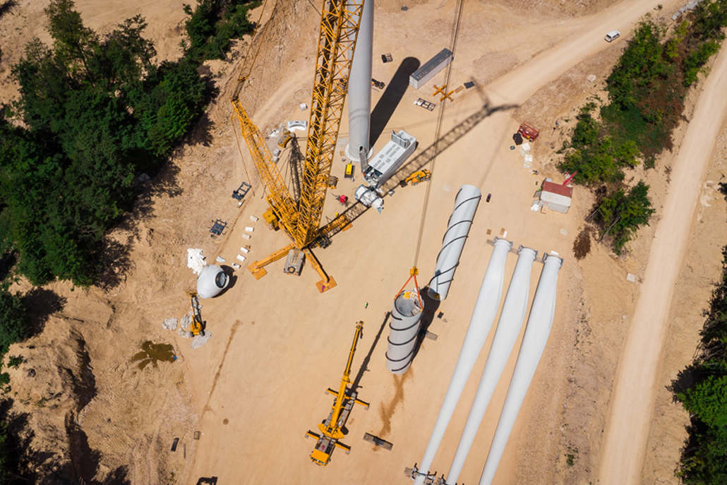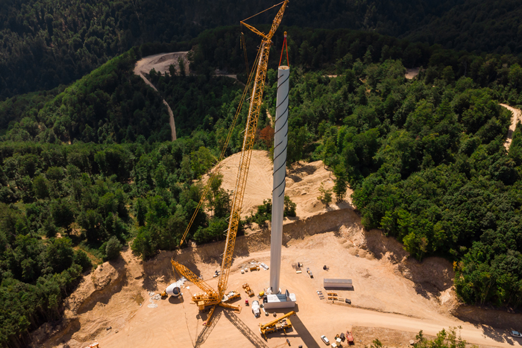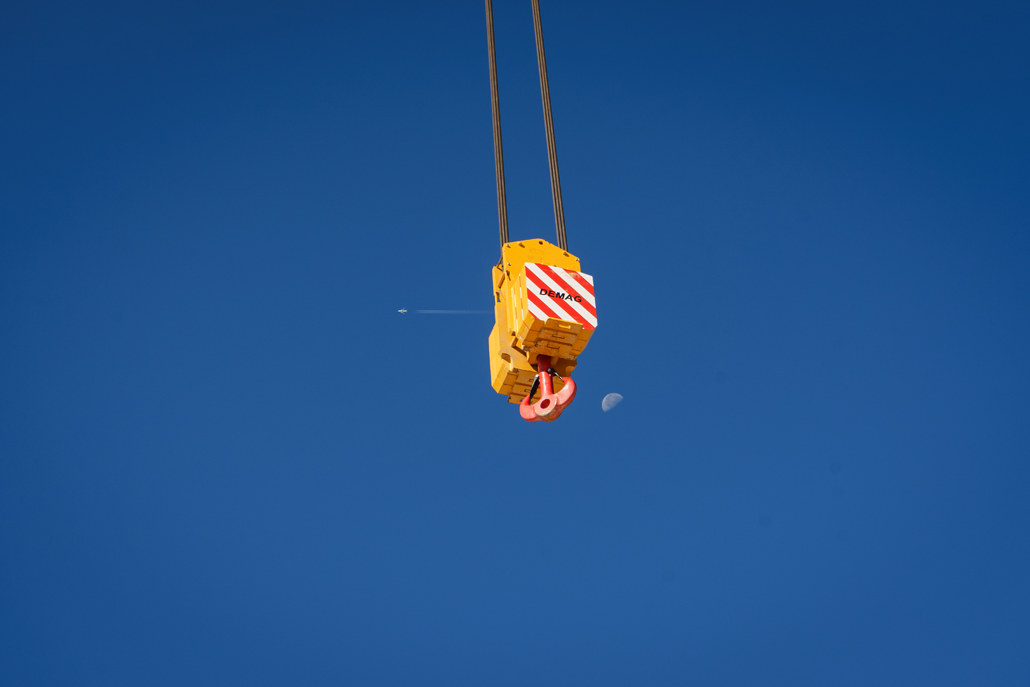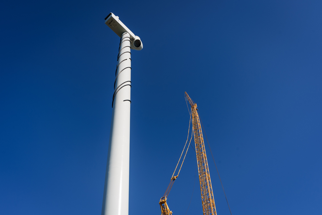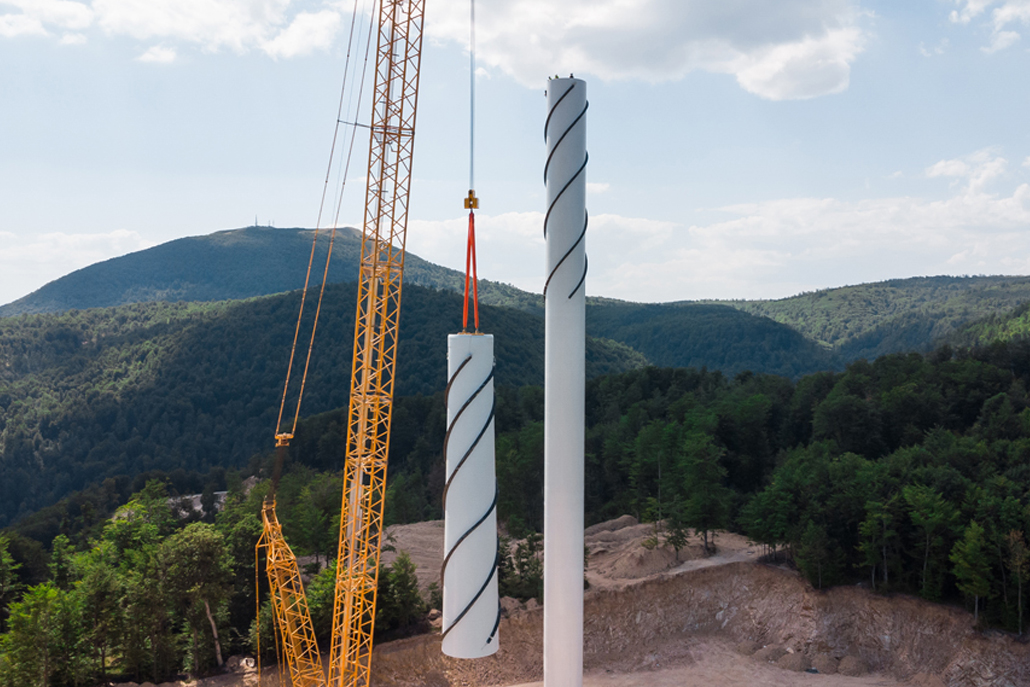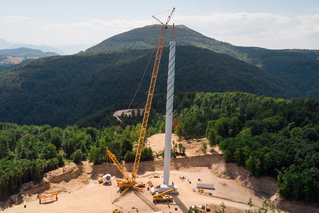Nato se je lahko začela zahtevna montaža turbin. Različne komponente so bile najprej vnaprej nameščene s 500-tonskim in 250-tonskim teleskopskim dvigalom. Sledila je montaža dveh delov stolpa, ki so ju nato dvignili na svoje mesto in trdno zasidrali s 600-tonskim dvigalom z rešetkasto roko ter 160-tonskim teleskopskim dvigalom v tandemskem dvigu. Preostali trije segmenti stolpa so bili vnaprej sestavljeni na tleh, nato pa dvignjeni na svoje mesto, s čimer je bil stolp vetrne turbine dokončan. S tem je bilo vse pripravljeno za naslednji korak.
