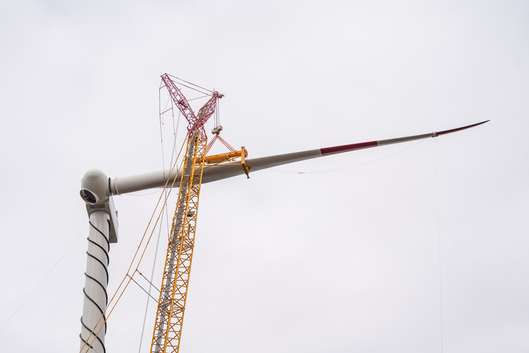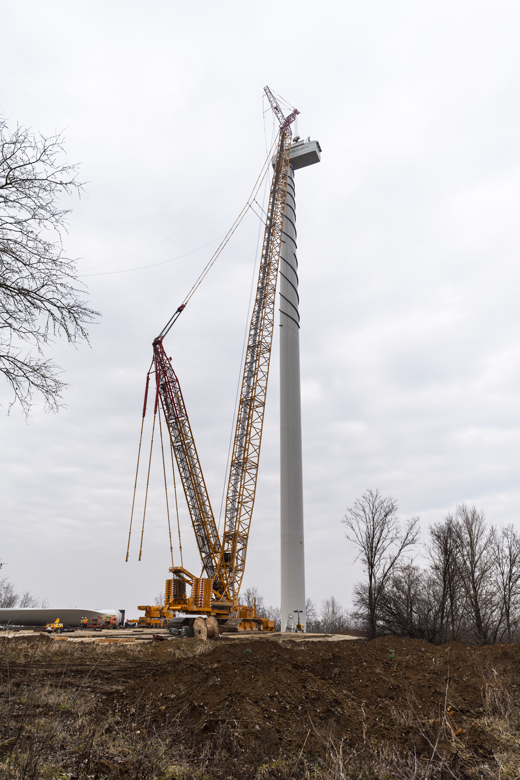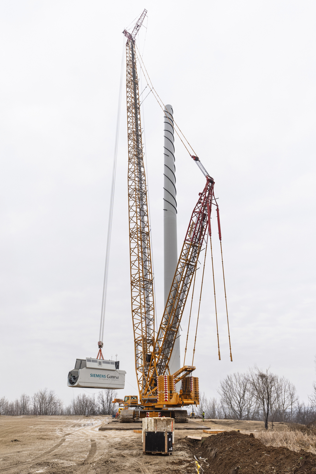 Zaradi svojih specifikacij je to gosenično dvigalo sposobno premikati in dvigovati vse komponente ter dvigovati znotraj manjšega radija kot druga dvigala. Za vsako vetrno turbino je bilo treba namestiti pet stolpnih segmentov, gondolo, pesto in pogonski sklop ter tri lopatice. Prvi korak je bila postavitev stolpa. Za podporo tej nalogi je bil zagotovljeno 200-tonsko teleskopsko dvigalo. 650-tonski velikan je skupaj z 200-tonskim dvigalom dvignil dele stolpa (vsak s težo 90,5 tone, 82,1 tone, 62,5 tone, 53,9 tone in 50,5 tone) v tandemskem dvigu.