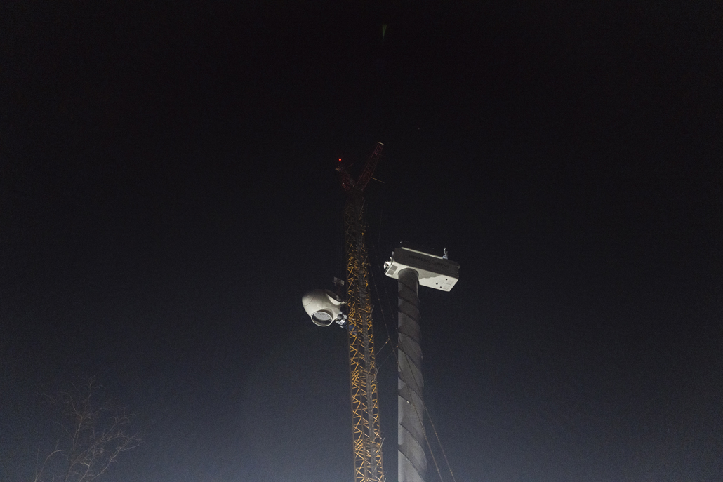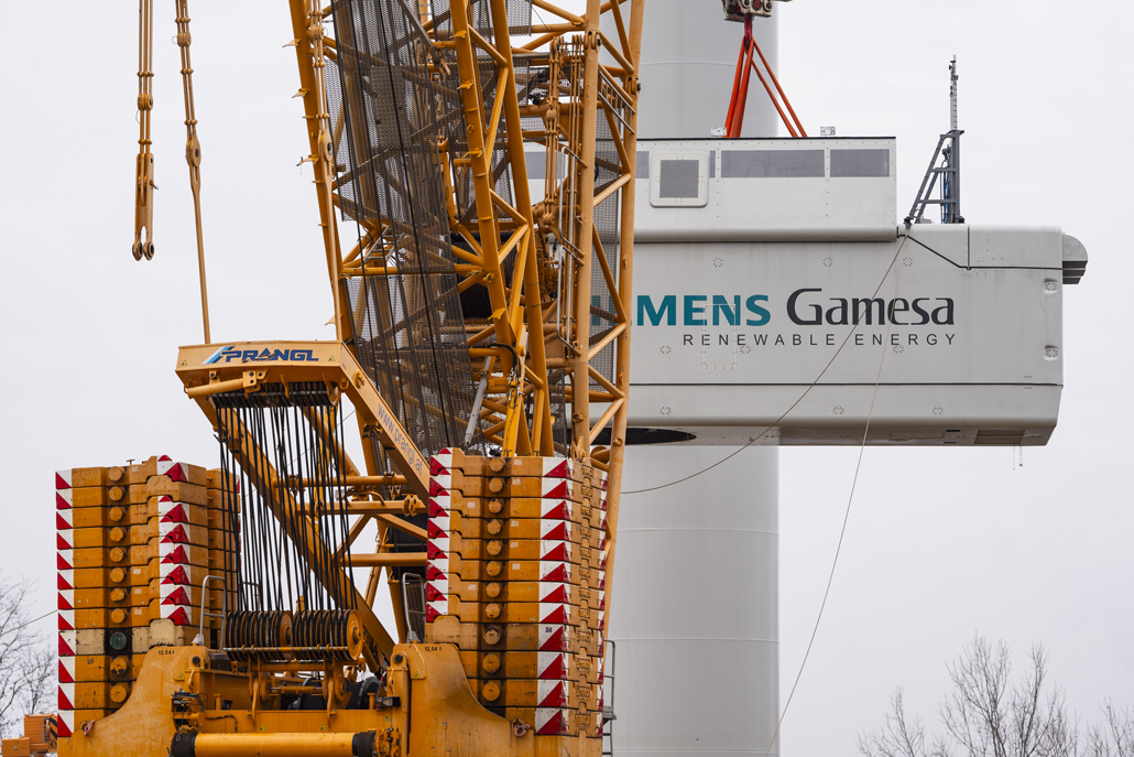 V naslednjem koraku sta bila pogonski sklop in pesto predhodno nameščena na tleh s pomočjo 200-tonskega pomožnega dvigala. Za dvigovanje pogonskega sklopa in pesta je bil nato uporabljen Pranglov Starker, ki je bil opremljen z LSL+LF (od 8 do 117 metrov + 12 metrov), glavnimi protiutežmi nosilnosti 225 ton, osrednjimi protiutežmi nosilnosti 50 ton ter protiutežmi SL nosilnosti 165 ton. Teža tega dvigala je znašala 107 ton. Ker je gosenično dvigalo sposobno dvigniti tako veliko težo, je bilo za vsak sistem prihranjenih več ur časa pri namestitvi.